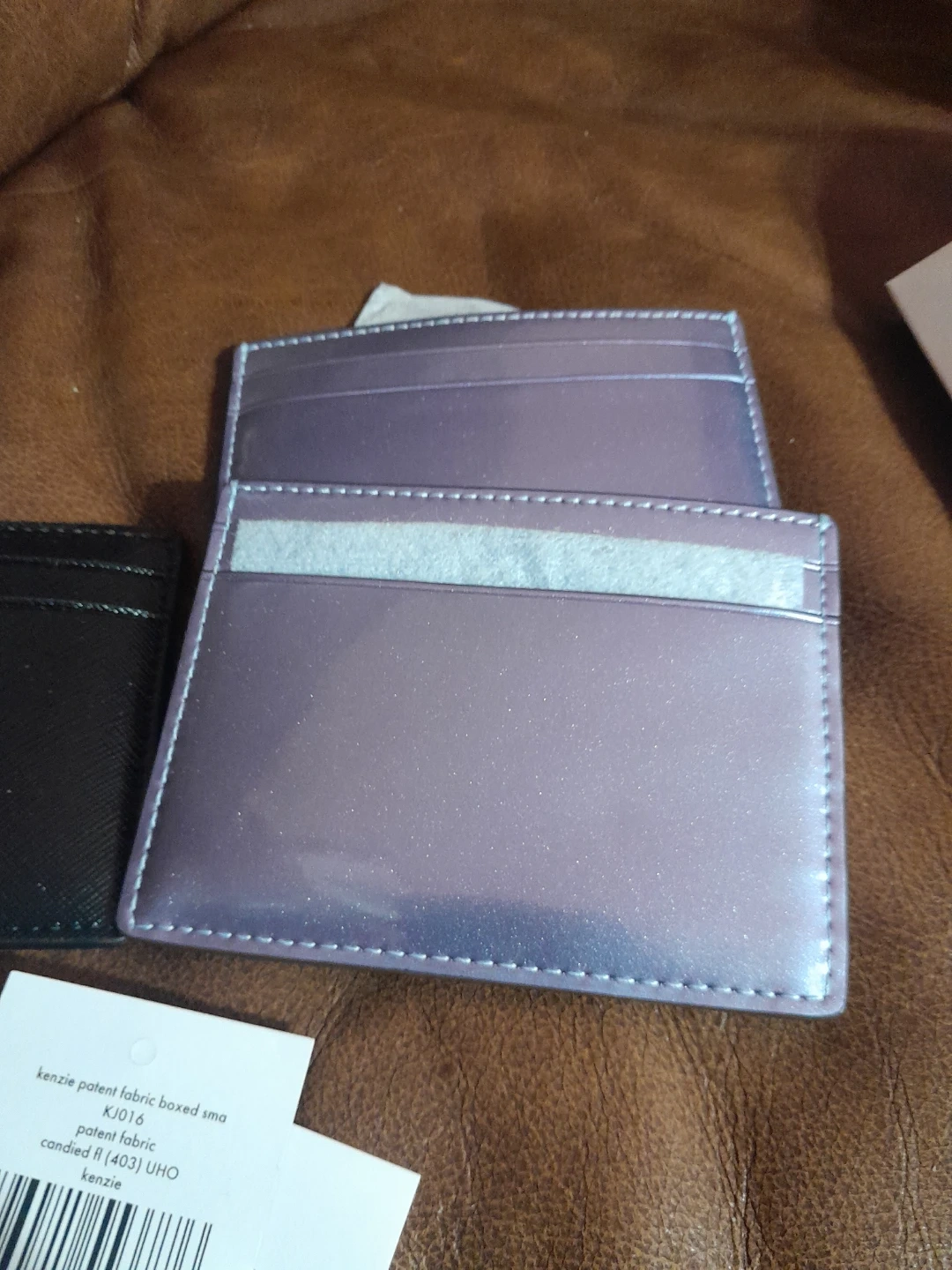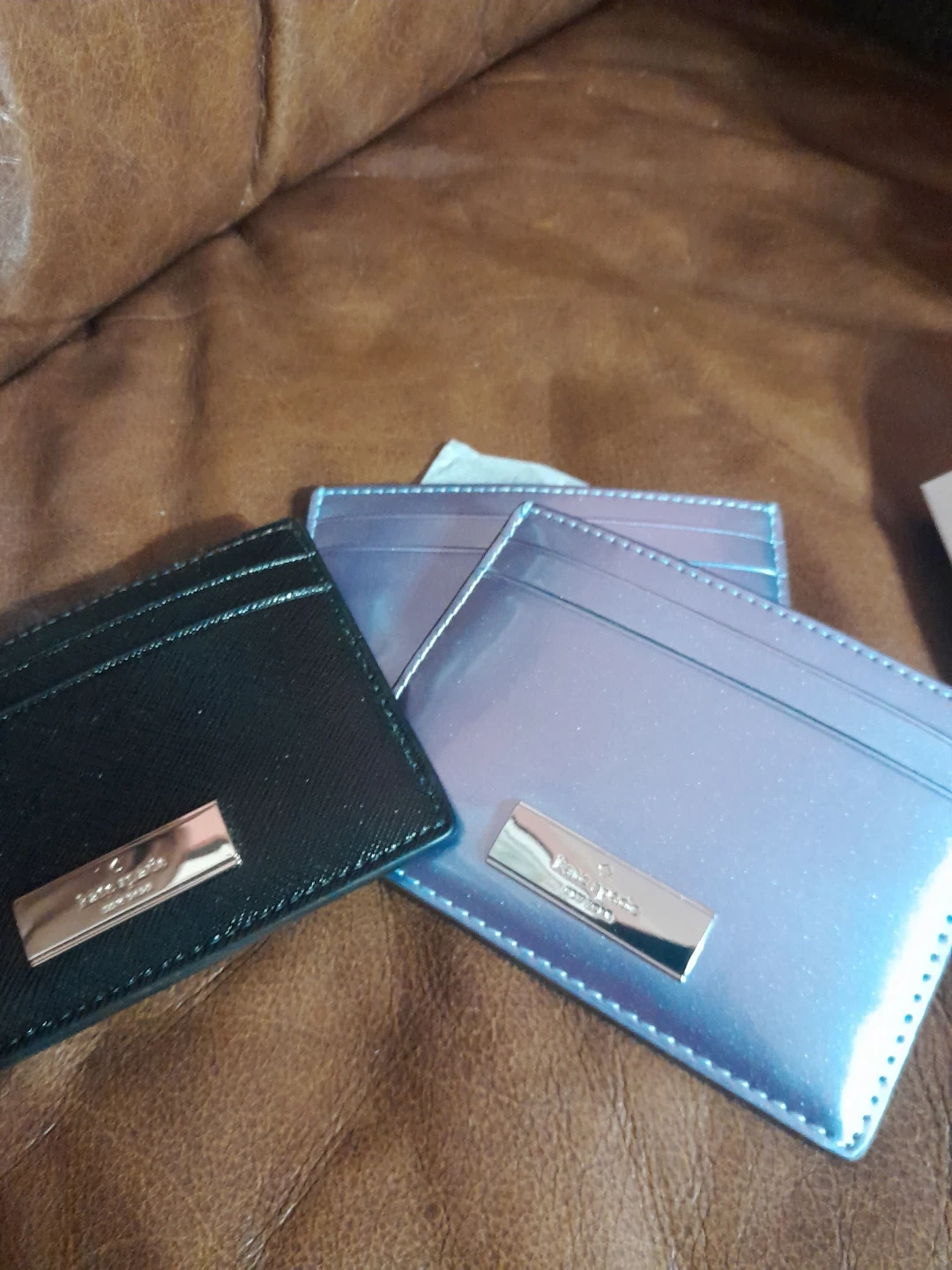 a black saffiano leather card holder and an iridescent card holder. Both are Kate Spade brand. Perfect for organizing your cards! They have 4 side card pockets, center pocket, retail for $99.00 brand new with tags your choice $15.00 each