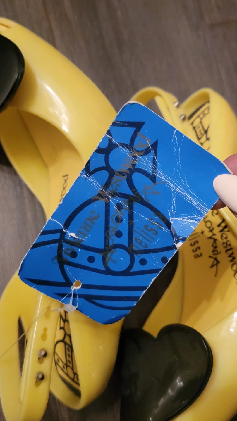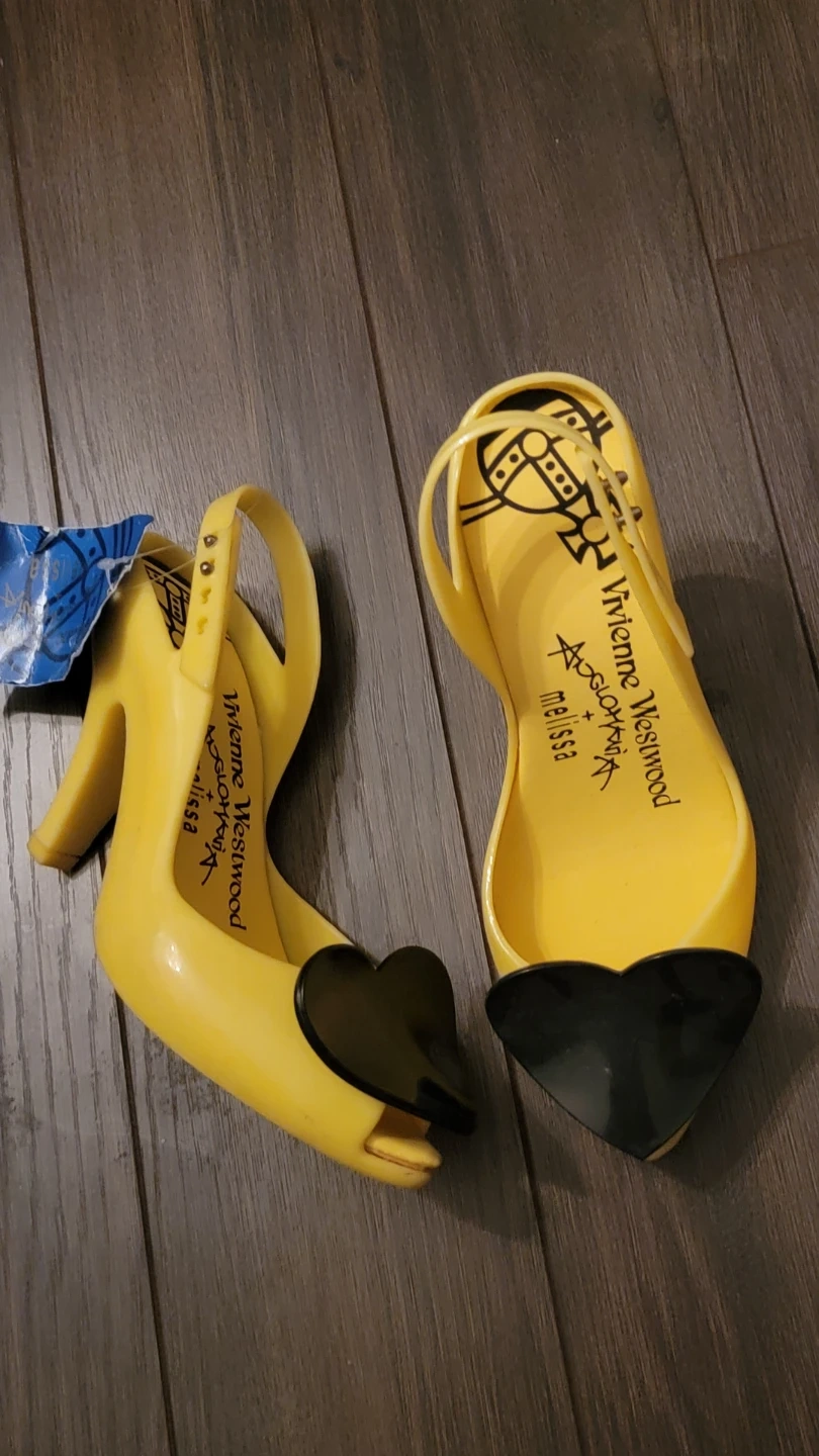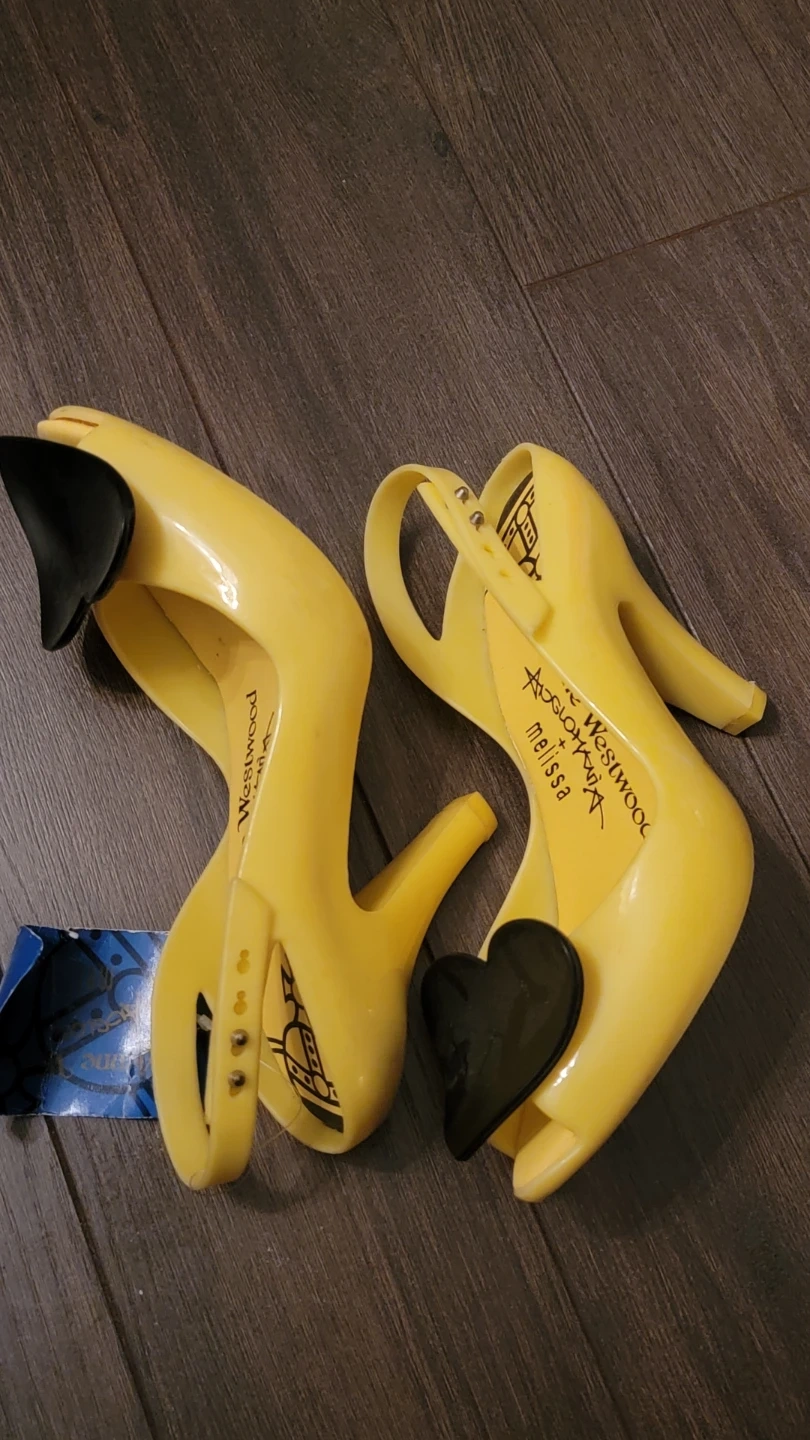 These Vivienne Westwood and Melissa jelly heels are bright yellow with black heart details. Made from durable PVC material. Perfect for adding a pop of colour to any outfit!