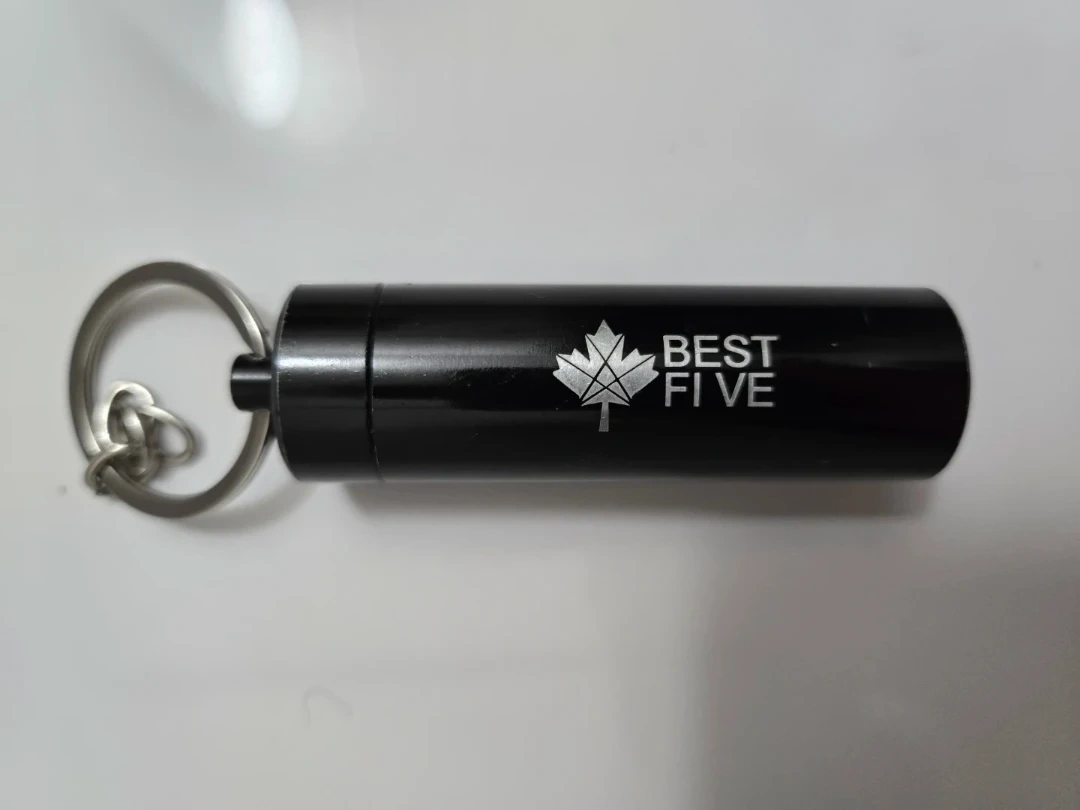This is a Best Five black pill container keychain. It's made of metal and includes a keyring. This container is useful for carrying medication on the go.