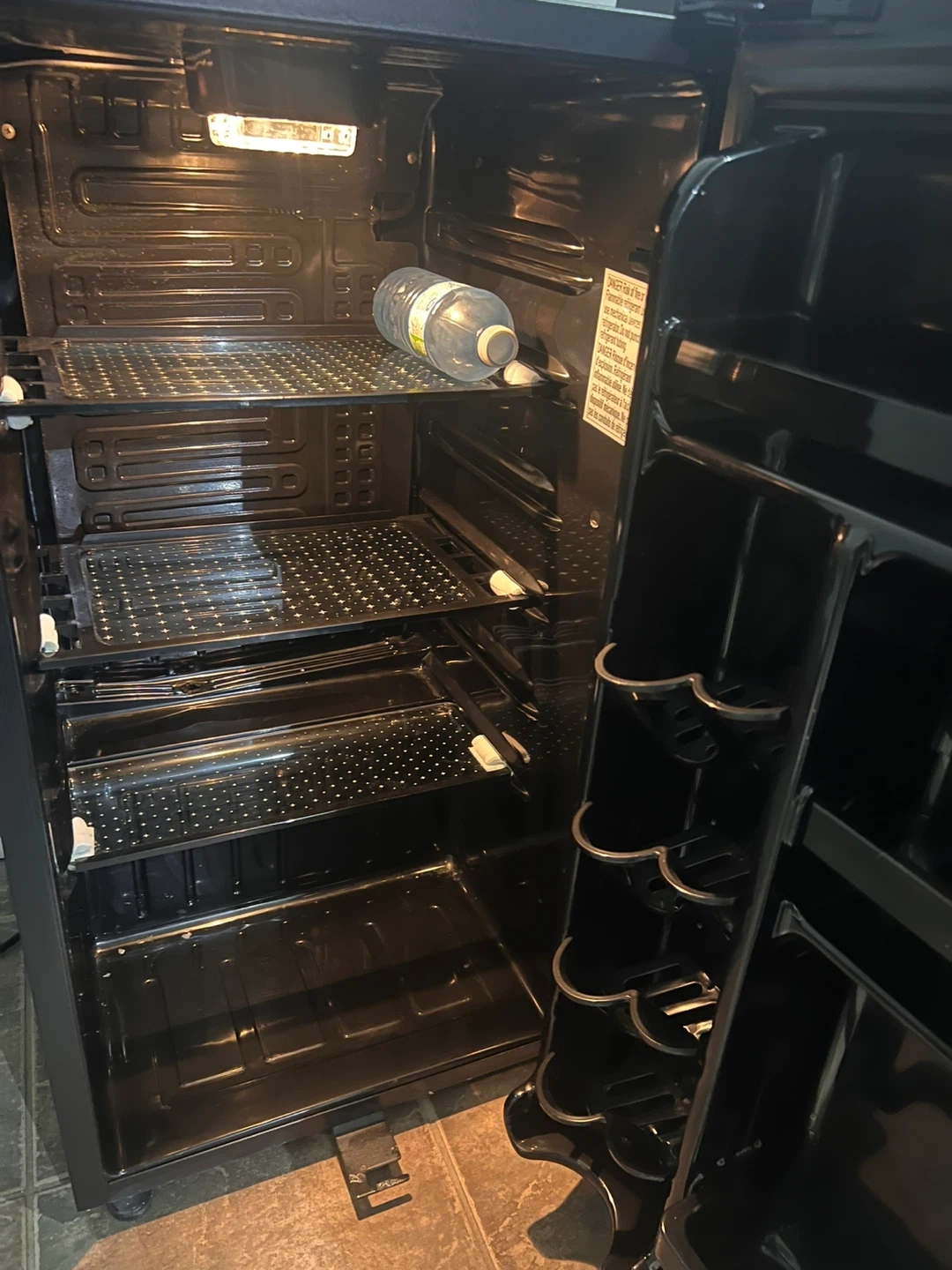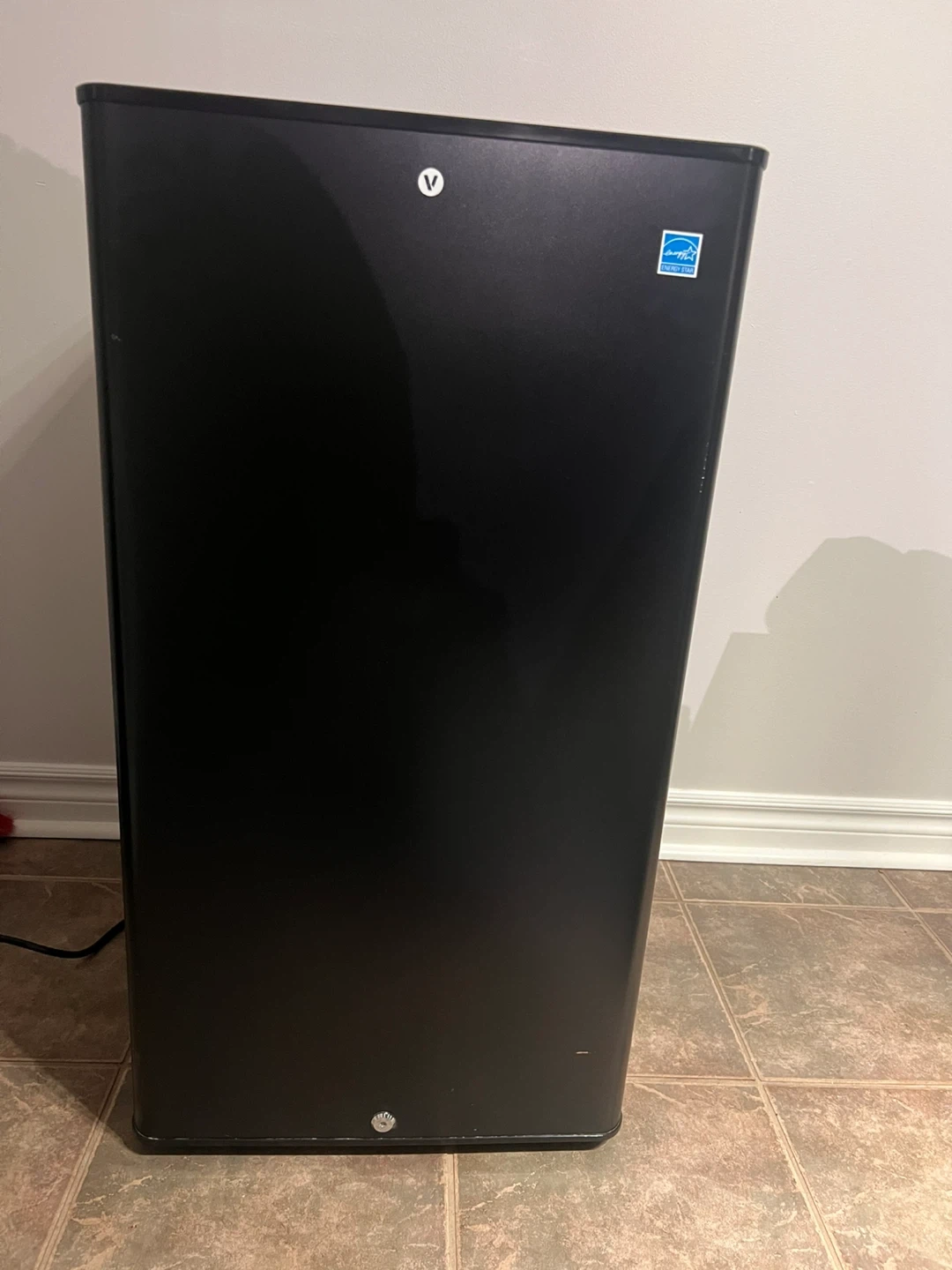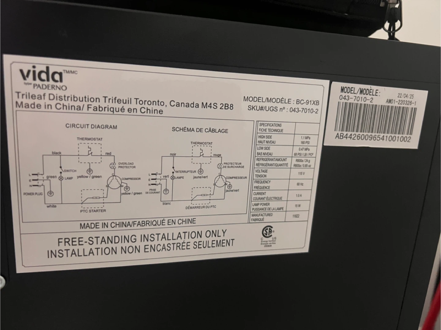 Paderno Vida mini fridge, model BC-91XB. It's black and has adjustable shelves. Energy Star certified. The unit is free-standing installation only. Includes a 15W lamp. No key