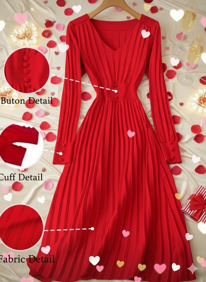 a New beautiful red midi dress featuring elegant pleats throughout. It has a V-neckline and button details on the bodice and cuffs.