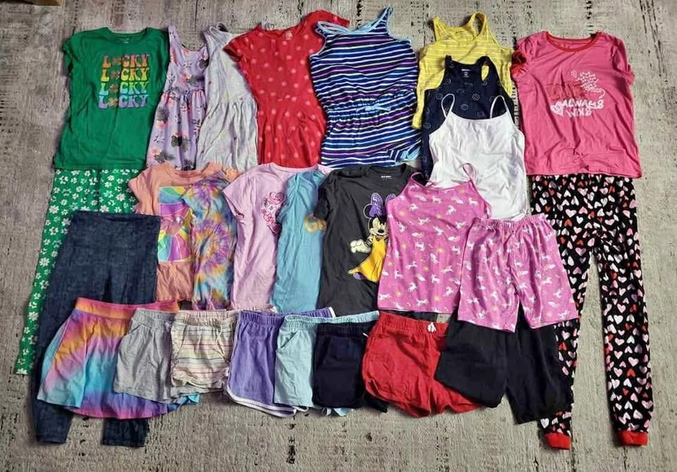 Girls size 14-16 Spring/Summer clothes lot. Mostly George, Old Navy and Children's Place brands. Includes: 3 dresses, 1 romper, 1 legging, 6 T-shirts, 4 sleeveless tops, 1 top/pants pajama set, 1 capri pant, 1 skort, and 8 shorts. Cash only.