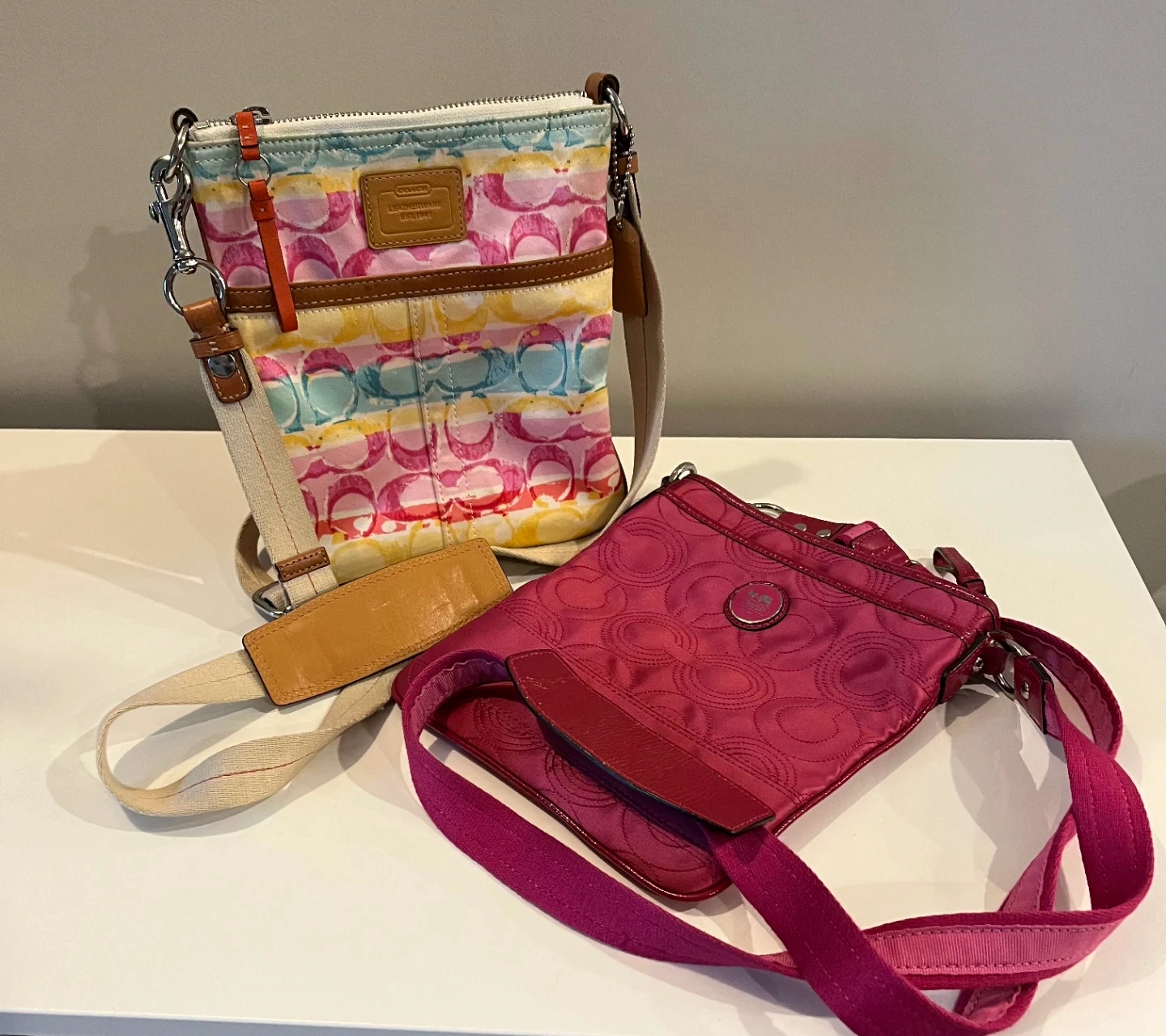 Two Coach crossbody purses are available. One features a vibrant multi-colour pattern with the signature 'C' logo. The other is a bright pink, also with a subtle quilted 'C' pattern. Both are stylish and practical for everyday use!