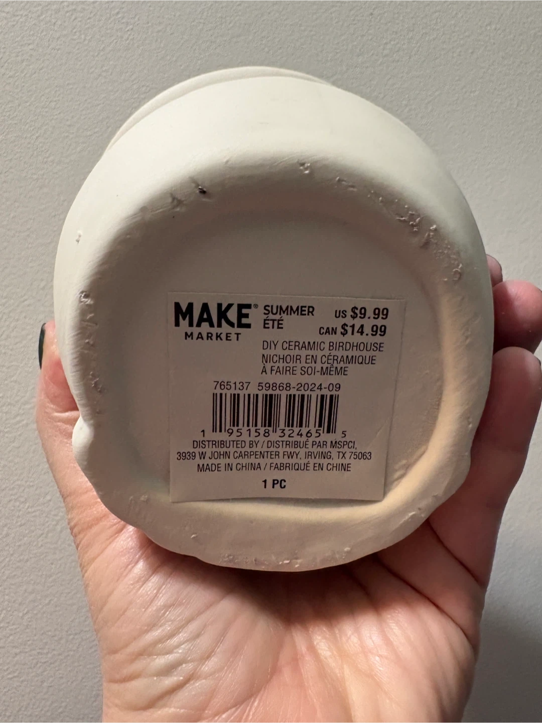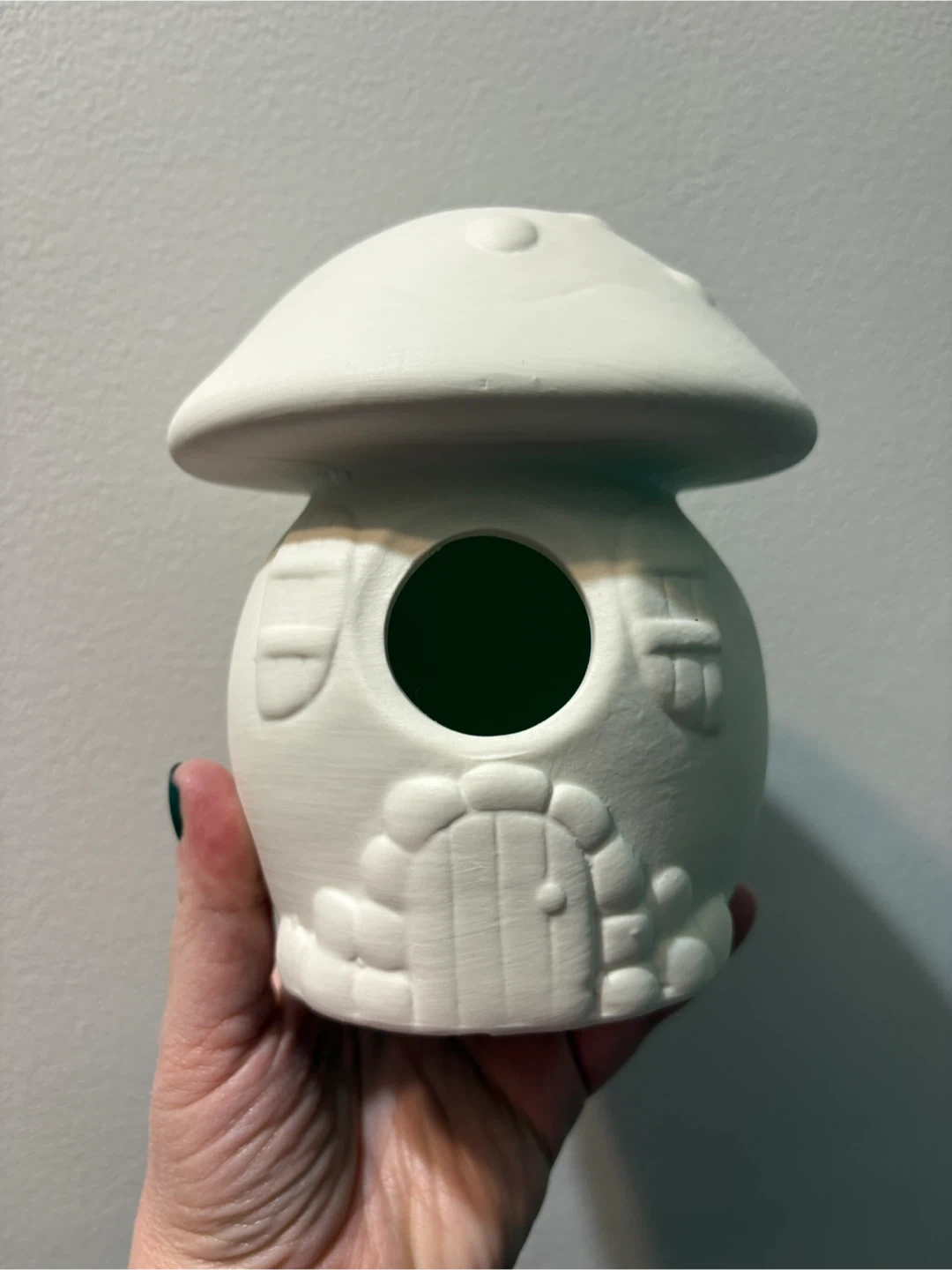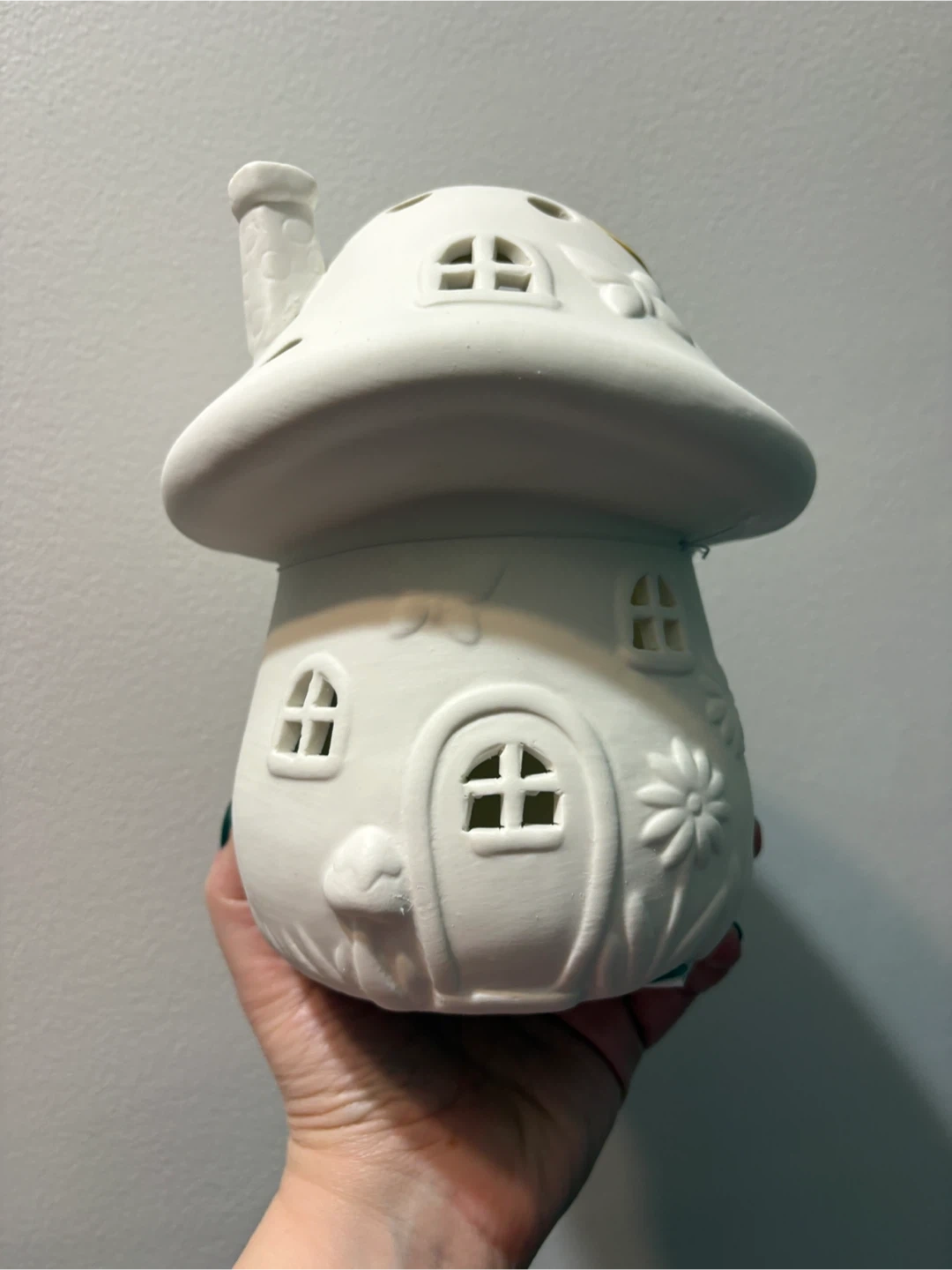 This is an unpainted ceramic mushroom house, ready for your creative touch! It's perfect for painting and decorating. Its whimsical design makes it a charming addition to any space.