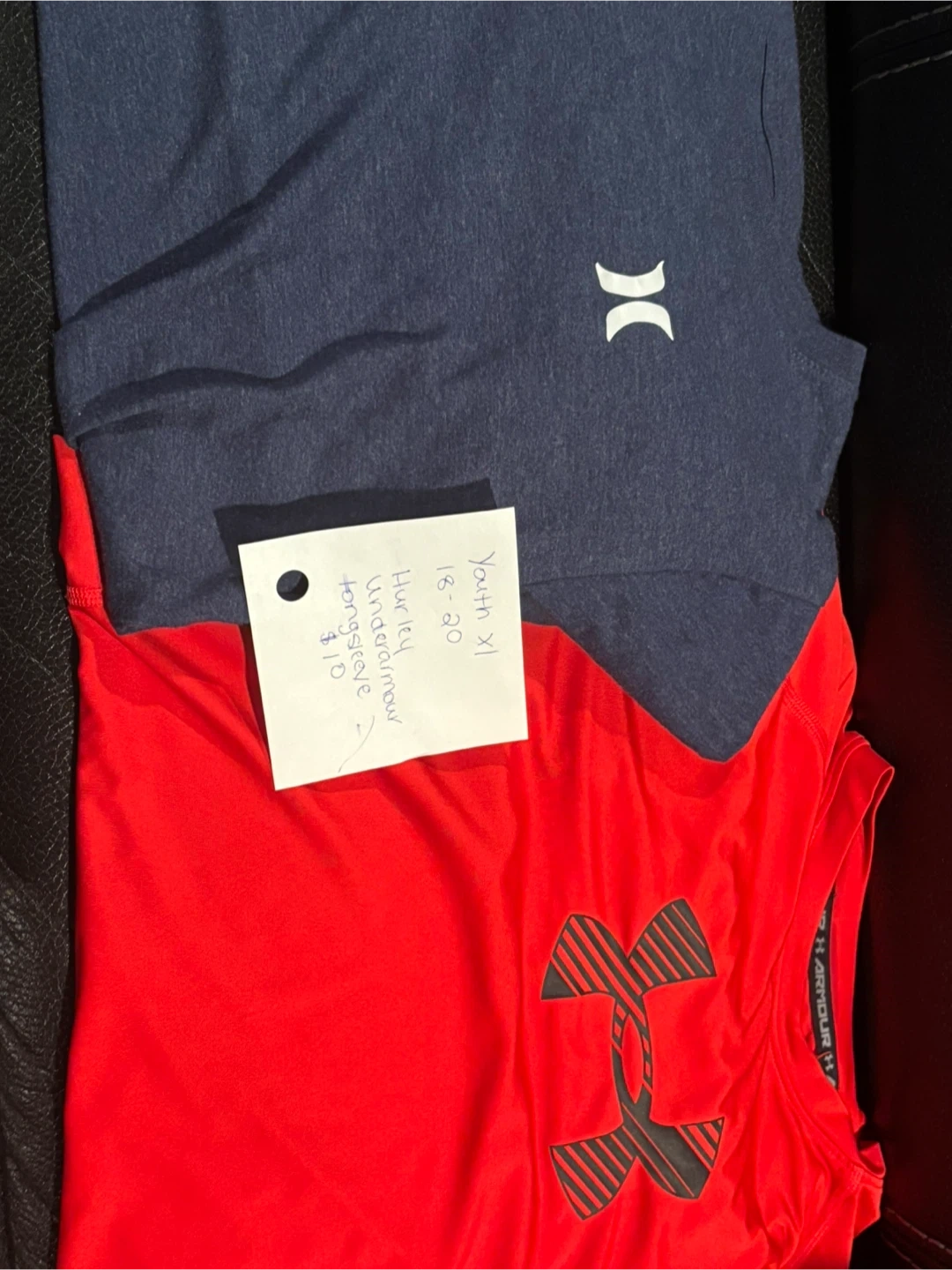 Two youth XL long sleeve shirts for sale! One is a navy blue Hurley shirt, and the other is a red Under Armour shirt. Both in great condition and ready for a new home
