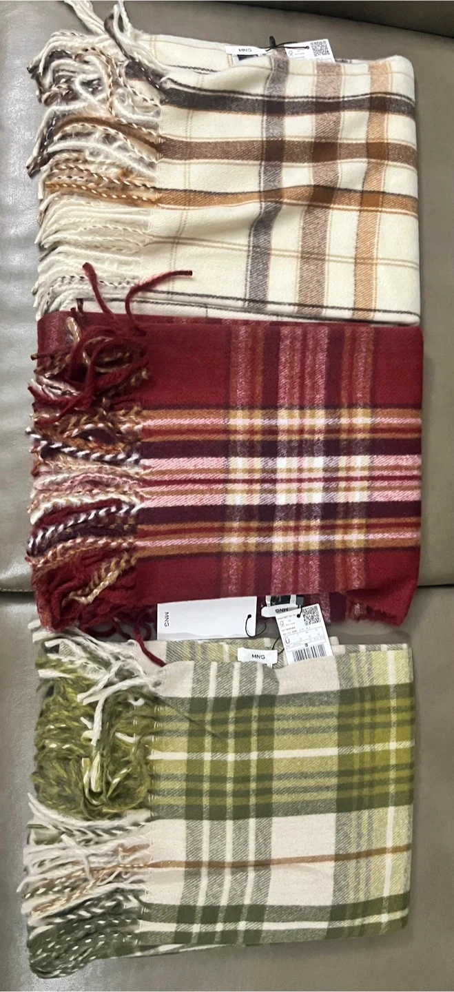 Here's a set of three Mango scarves, perfect for adding a touch of style to any outfit! They come in a variety of plaid patterns and colours. Great for keeping warm and fashionable during cooler weather. Brand new with tag intact, original price per piece $29.99, buy individual or in set. Buy one for $20 or the set for $50