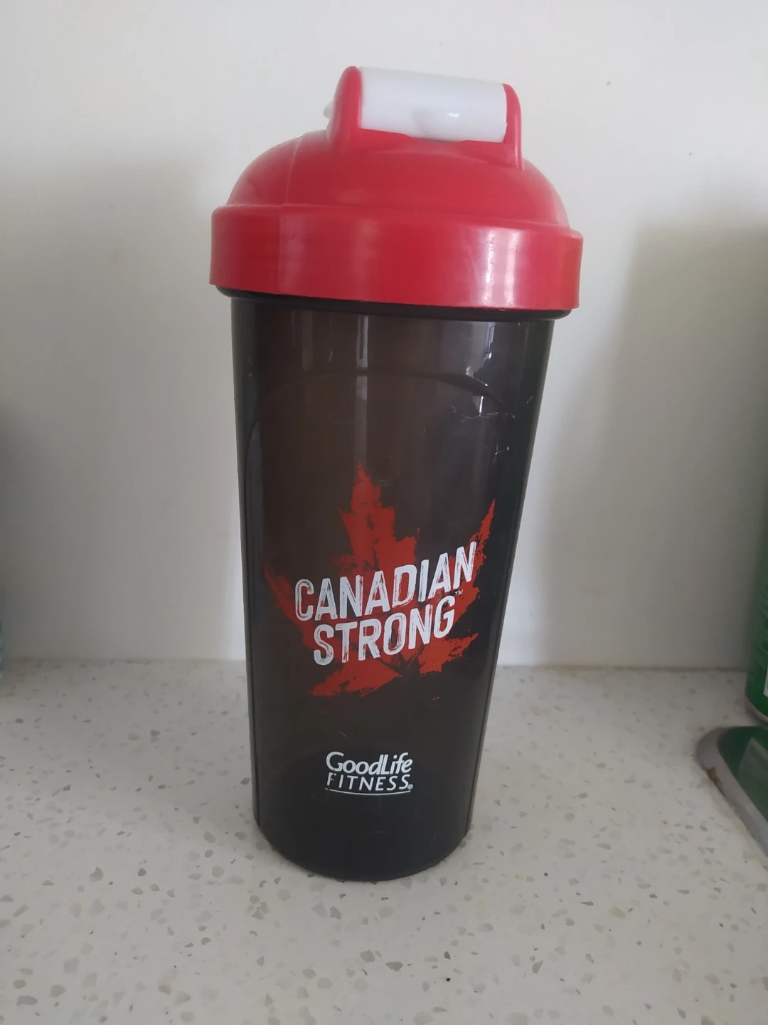 This is a GoodLife Fitness shaker bottle with "Canadian Strong" printed on it. It features a red lid and a dark, translucent body. This bottle is great for mixing protein shakes or other beverages on the go. It's made of durable plastic.