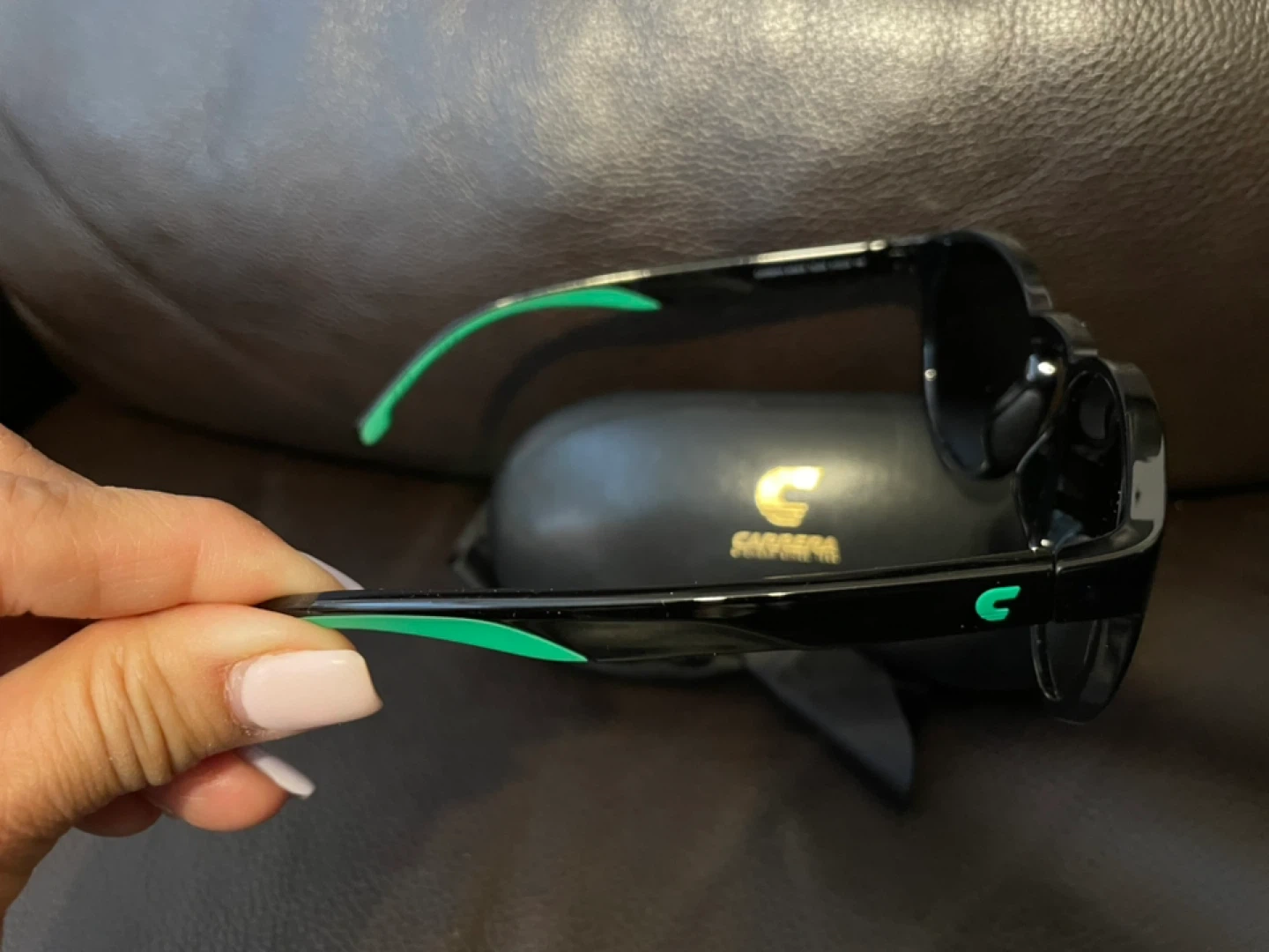 Selling a pair of Carrera 6056/S sunglasses. They are black with green accents. Includes the case and cleaning cloth. New