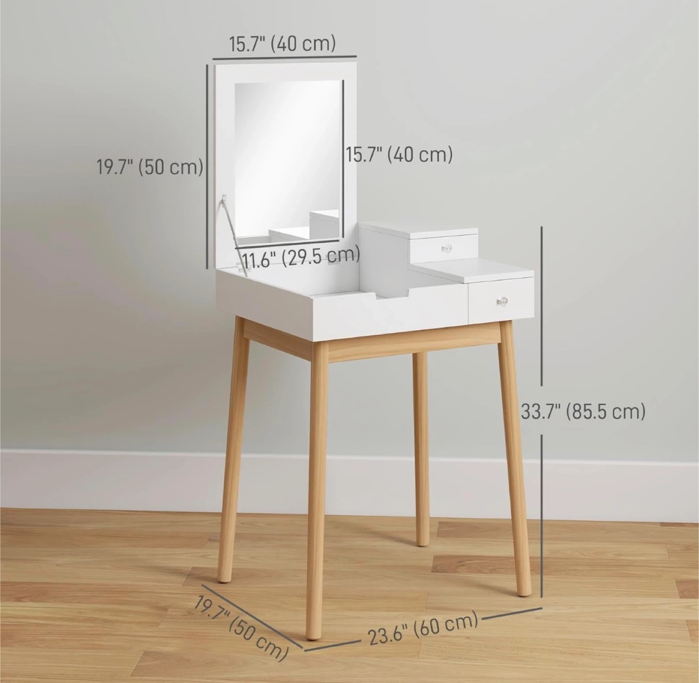 This versatile vanity table and writing desk features a lift-top mirror and ample storage. It has a large main compartment and two drawers for organizing your essentials. The unit's dimensions are 23.6" (60 cm) wide, 19.7" (50 cm) deep, and 33.7" (85.5 cm) high. It's perfect for smaller spaces needing dual functionality!