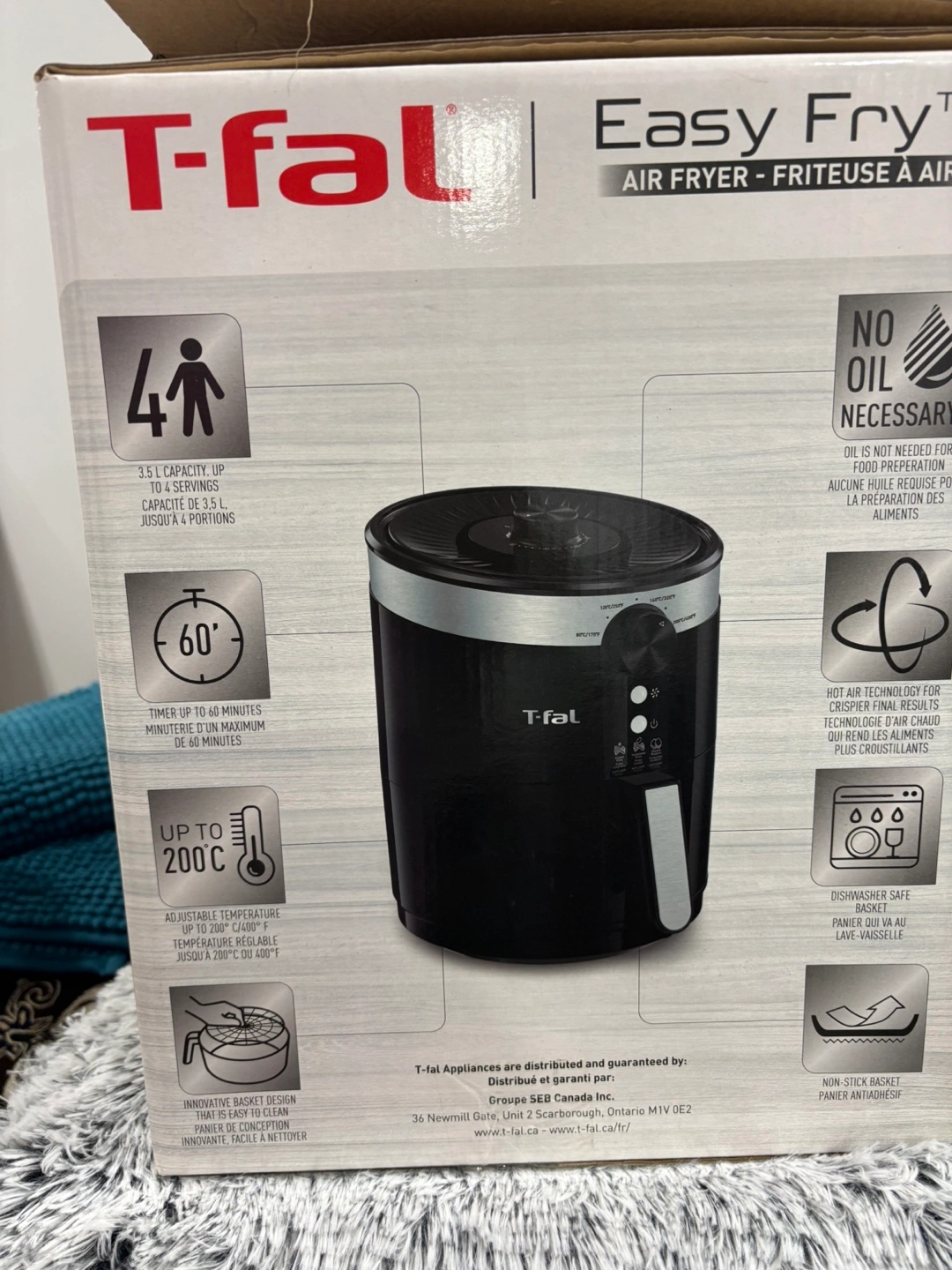 37Selling a brand new T-fal Easy Fry Air Fryer! It's still in its original box and has never been used. This air fryer is a healthy solution for crispy fried foods, using little to no oil. It has a 3.5L capacity, enough for up to 4 servings. The timer can be set for up to 60 minutes, and the temperature is adjustable up to 200°C. Dishwasher safe basket included for easy cleaning