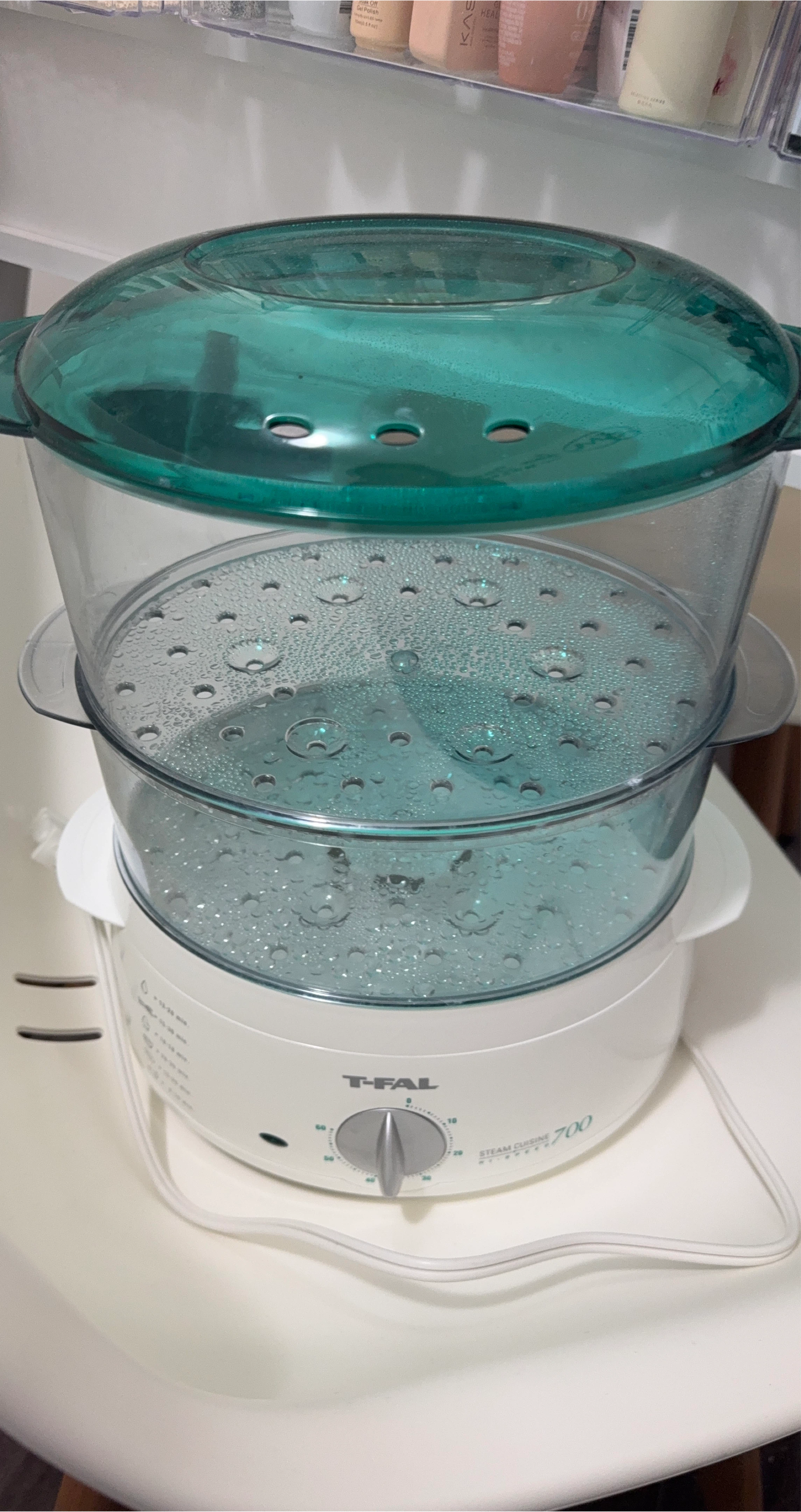 30Selling a T-Fal Steam Cuisine 700. It's perfect for steaming vegetables and other foods. It has a two-tiered design with a transparent green lid and steaming trays. The base is white with a timer dial. Great addition to any kitchen!