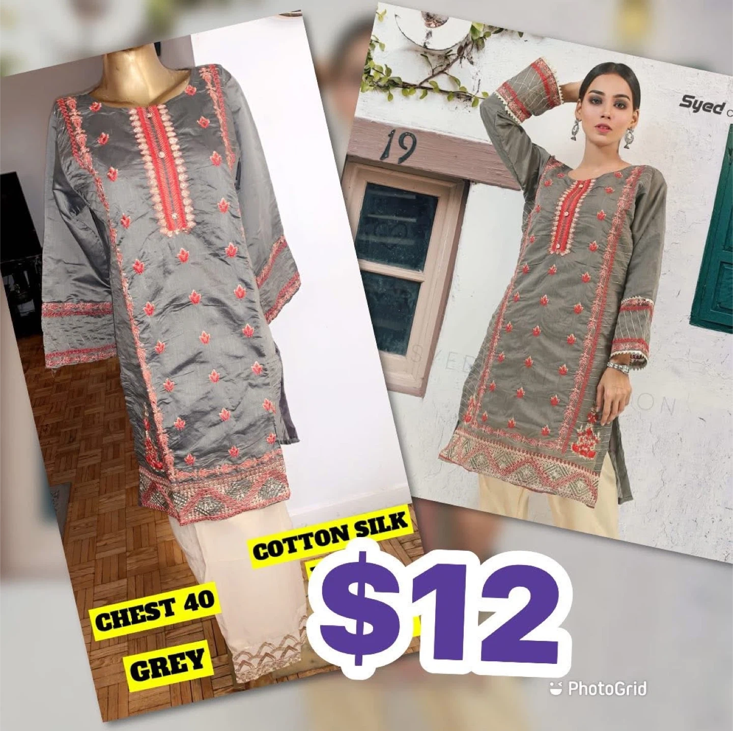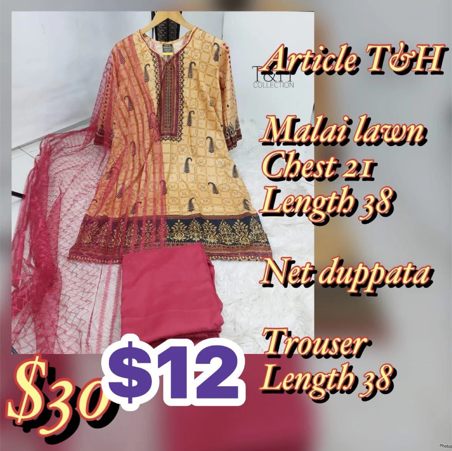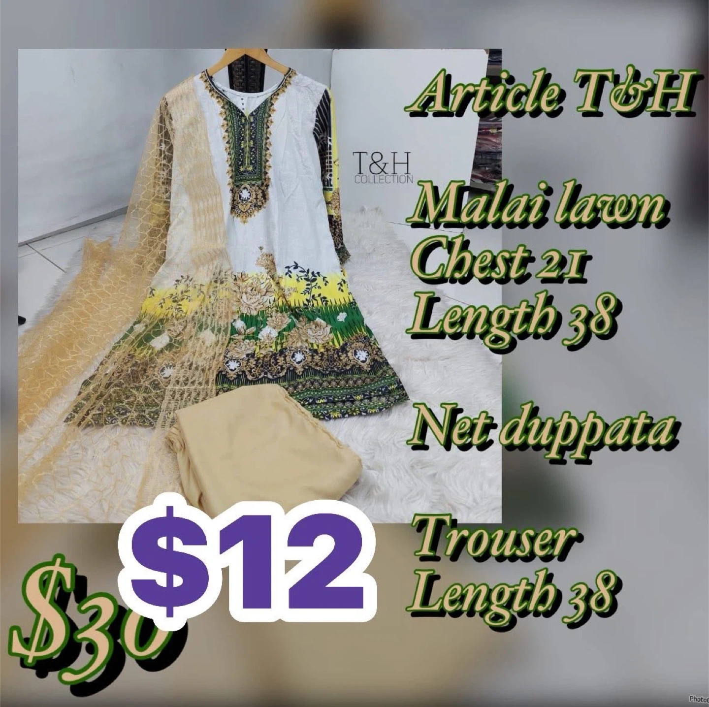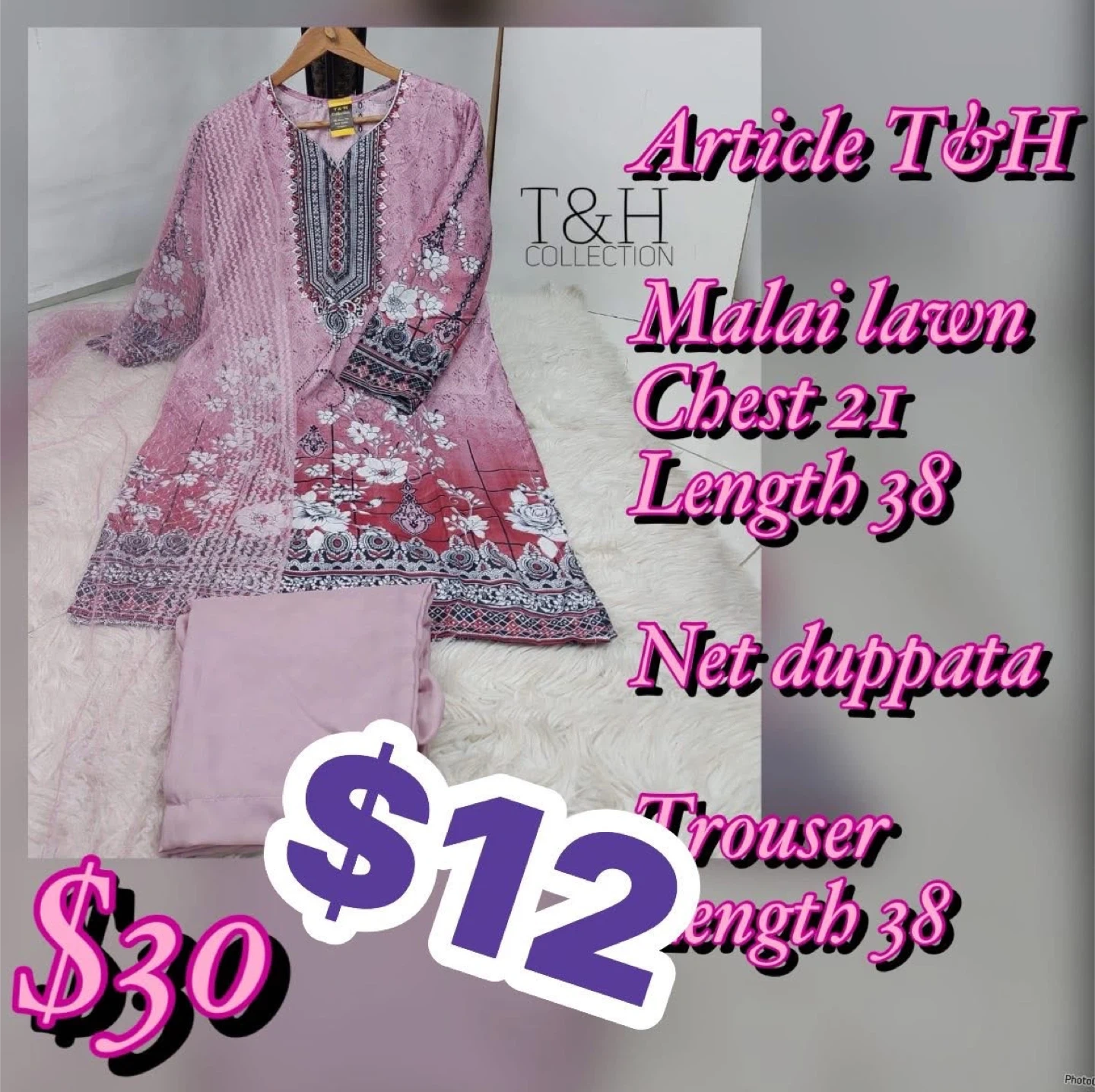 25Beautiful T&H Collection suit made of Malai lawn material. The chest measures 21 inches and the length is 38 inches. It includes a net dupatta and trousers with a length of 38 inches. Available in various colours!