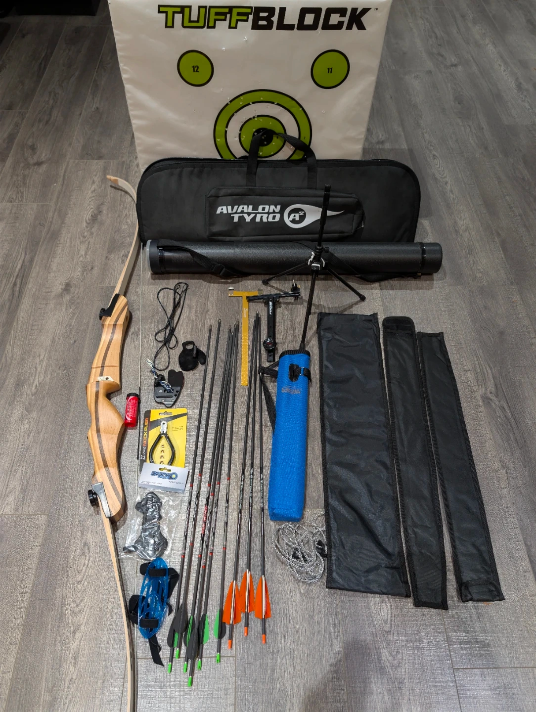 This Jandao recurve bow comes with a TuffBlock target and many accessories. It's suitable for beginners looking to get into archery. Comes with everything you see in the photo.