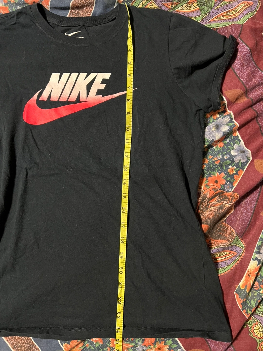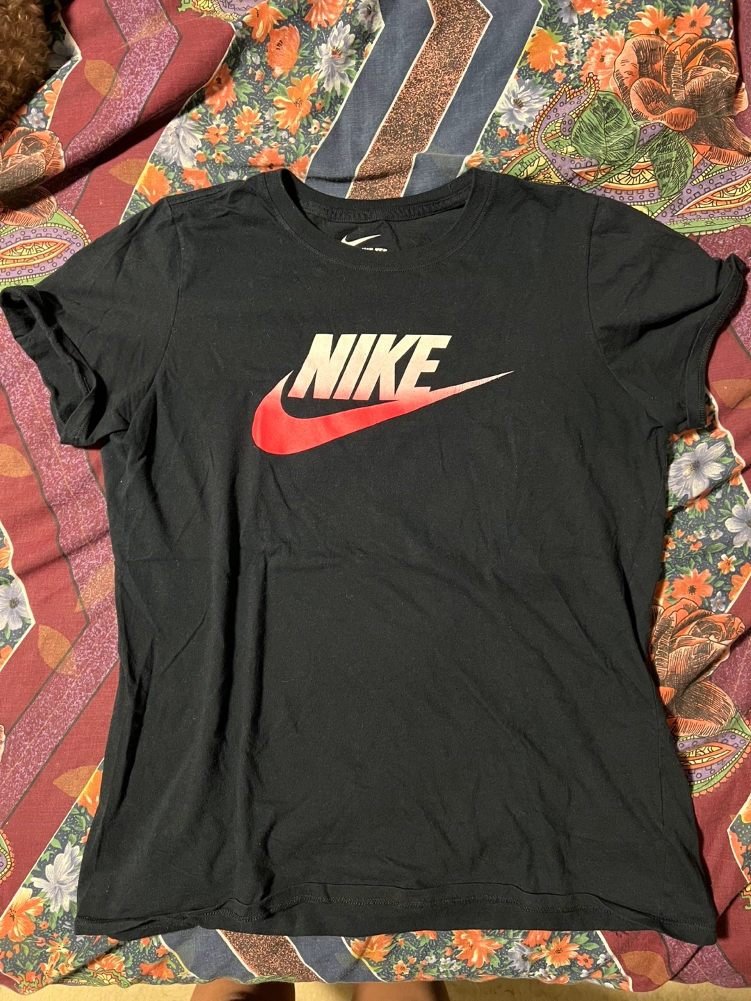 Selling a comfy Nike black t-shirt in size L. The shirt features the classic Nike logo in red and white. It's in great condition and ready for a new home!
