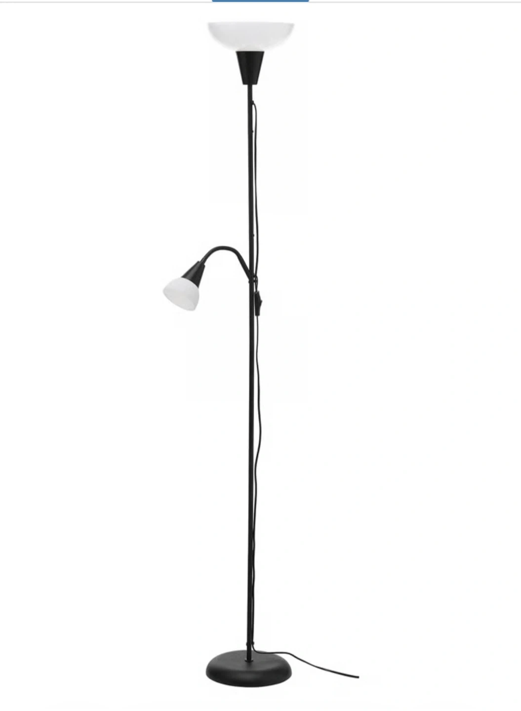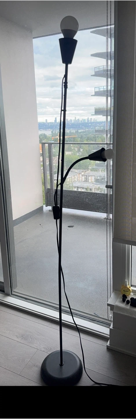 This black floor lamp features two adjustable heads for targeted lighting. It has a sturdy base and a flexible gooseneck design. Perfect for reading or task lighting in any room! With light cover & light bulb - full set