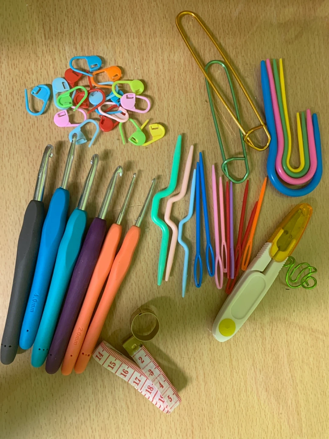 This crochet hook set includes a variety of sizes and colours. It also comes with stitch markers, a yarn needle, a measuring tape, and a pair of scissors. Great for all your knitting and crochet projects!