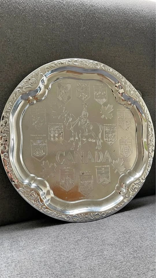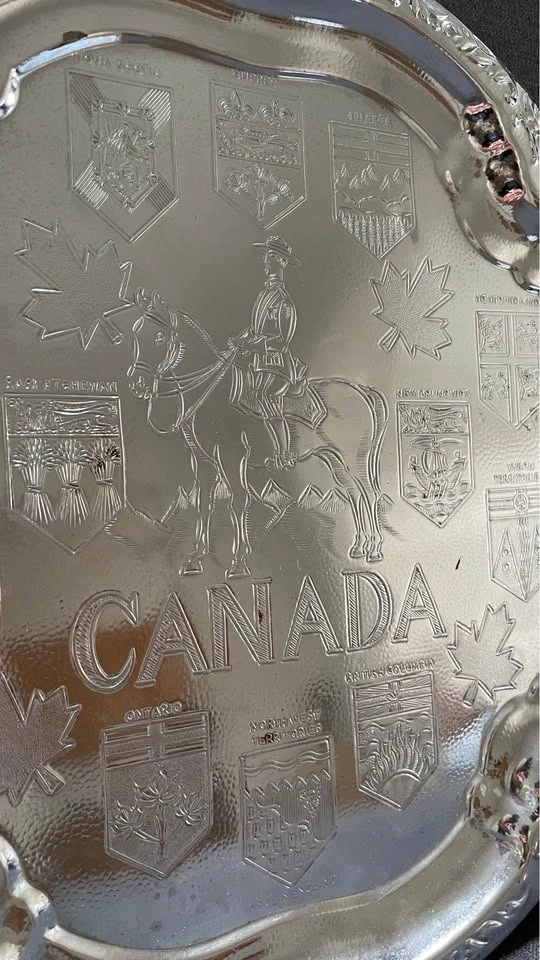Selling a vintage commemorative tray featuring Canadian provincial emblems and a central image of a Mountie on horseback. It's a lovely piece for display or serving. The tray is in good condition and has a nice decorative edge.