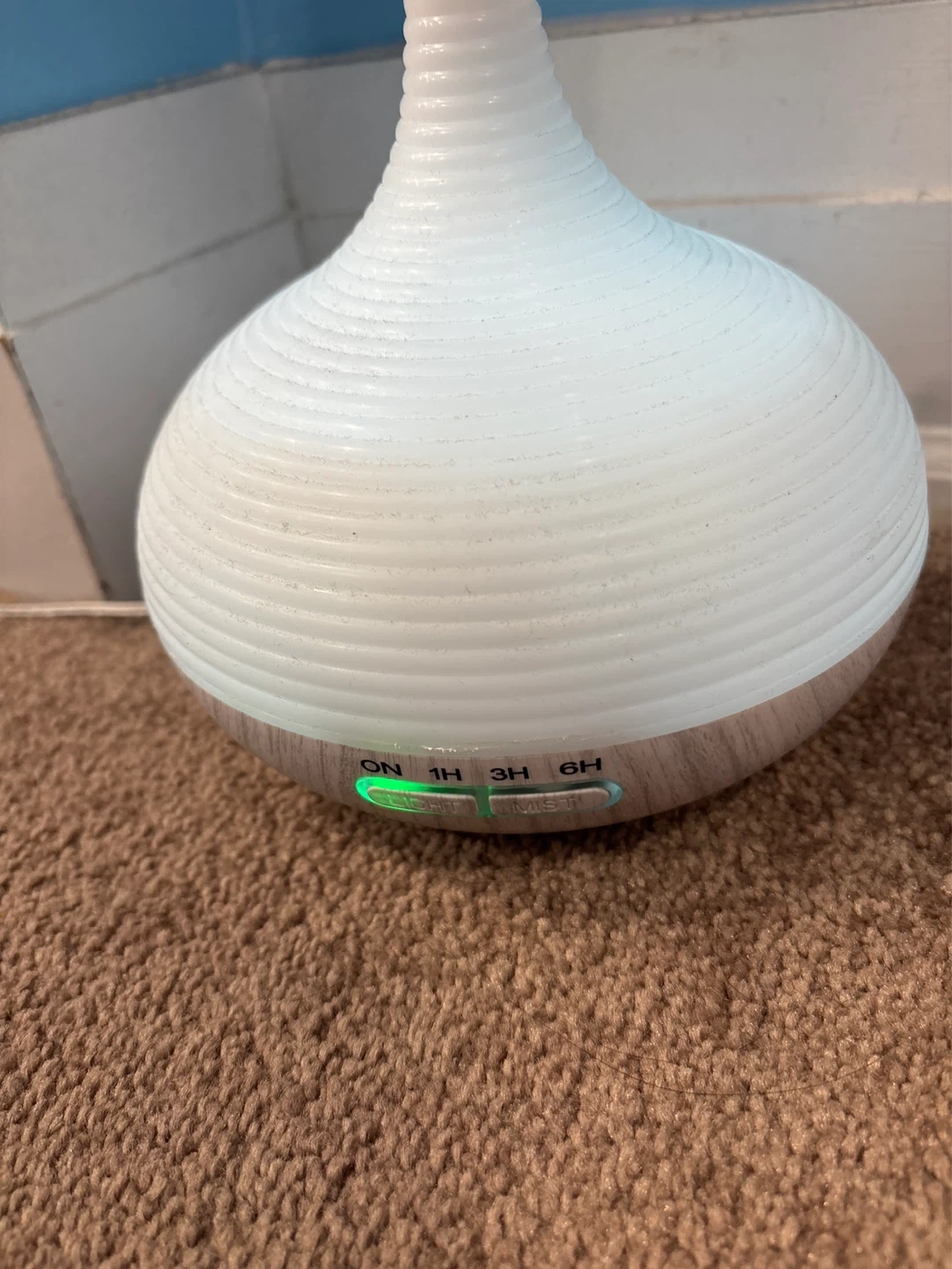This Air humidifier has a ribbed design and adjustable mist settings with timer options for 1, 3, or 6 hours. It also features coloured LED lighting, cycling through various soft hues. This Air humidifier is great for creating a relaxing atmosphere in and Moistur the room.