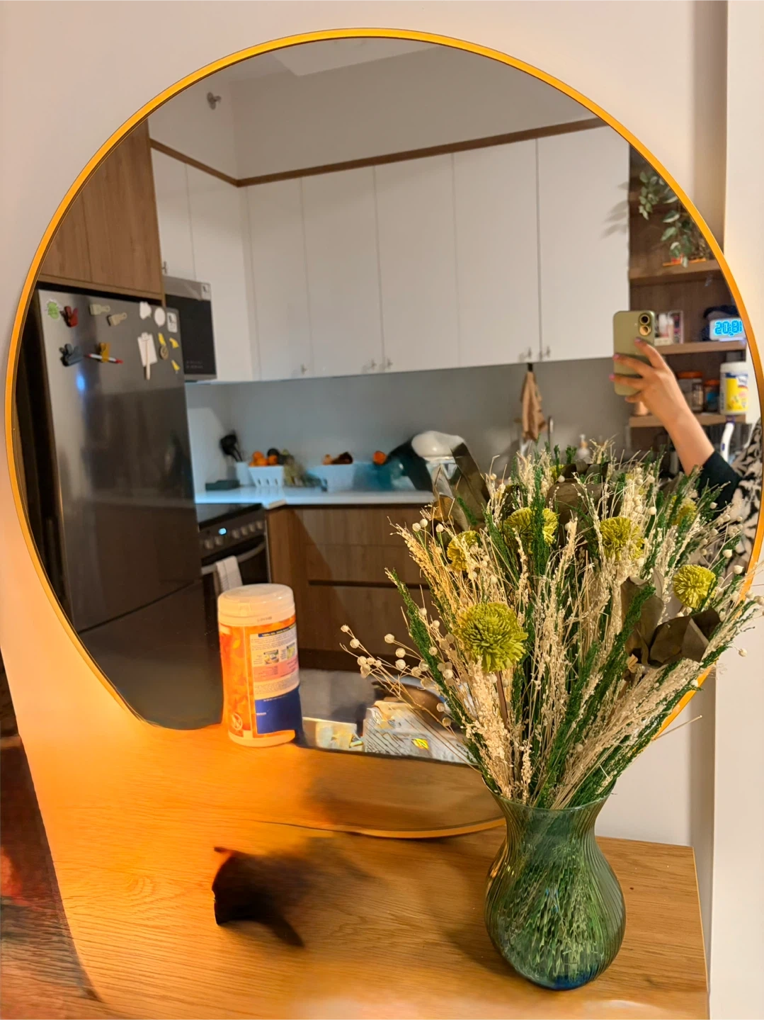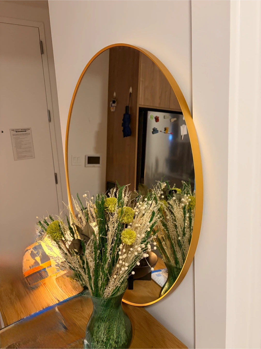 This is an oval wall mirror with a sleek gold-toned metal frame. It's perfect for adding a touch of elegance to any entryway or living space. The reflective surface helps to brighten up your room. Hej, Check out this LINDBYN from IKEA. https://applink.ikea.com/tY8M9r9M4w--70506119--us--en