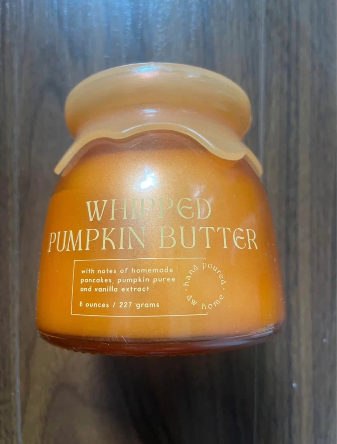 Selling a 'dw home' hand-poured candle with a lovely whipped pumpkin butter scent! It has notes of homemade pancakes, pumpkin puree, and vanilla extract. The candle is 8 ounces / 227 grams