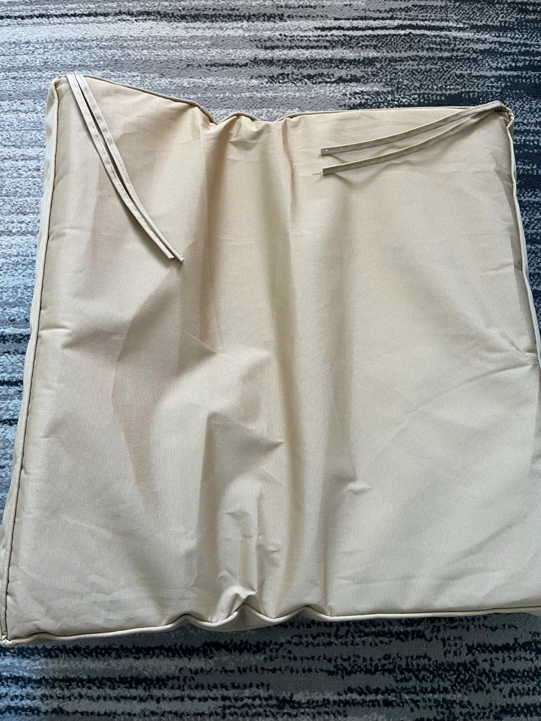 A set of outdoor cushions in a neutral beige colour. Comes with one large seat cushion and a back cushion. The fabric appears to be water-resistant and durable. Includes ties to secure them in place. The cushions are firm. Pick up only.