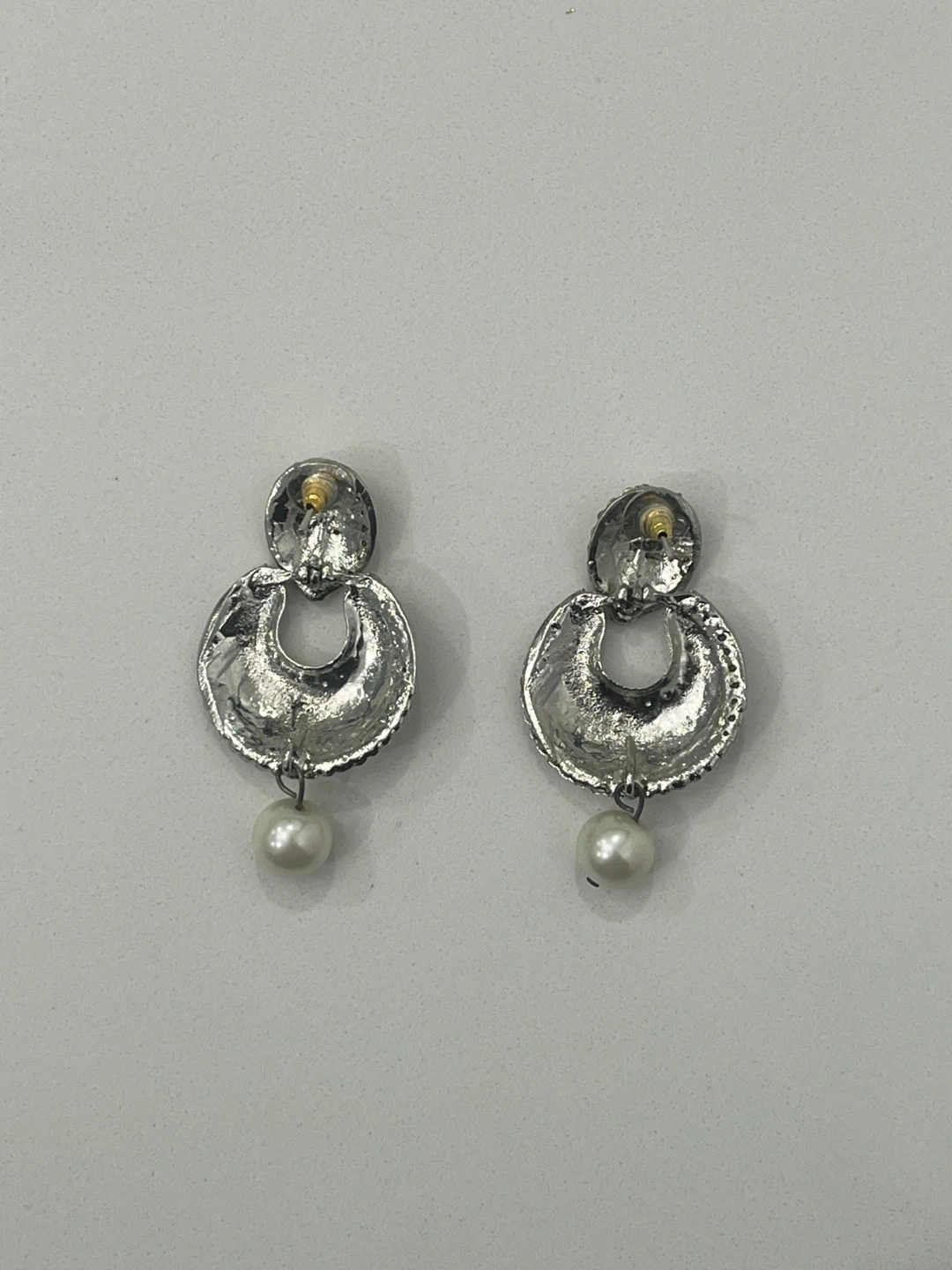 Sparkling silver tone drop earrings adorned with pearls and clear crystal accents. They feature a decorative circular top with intricate detailing and a dangling faux pearl.