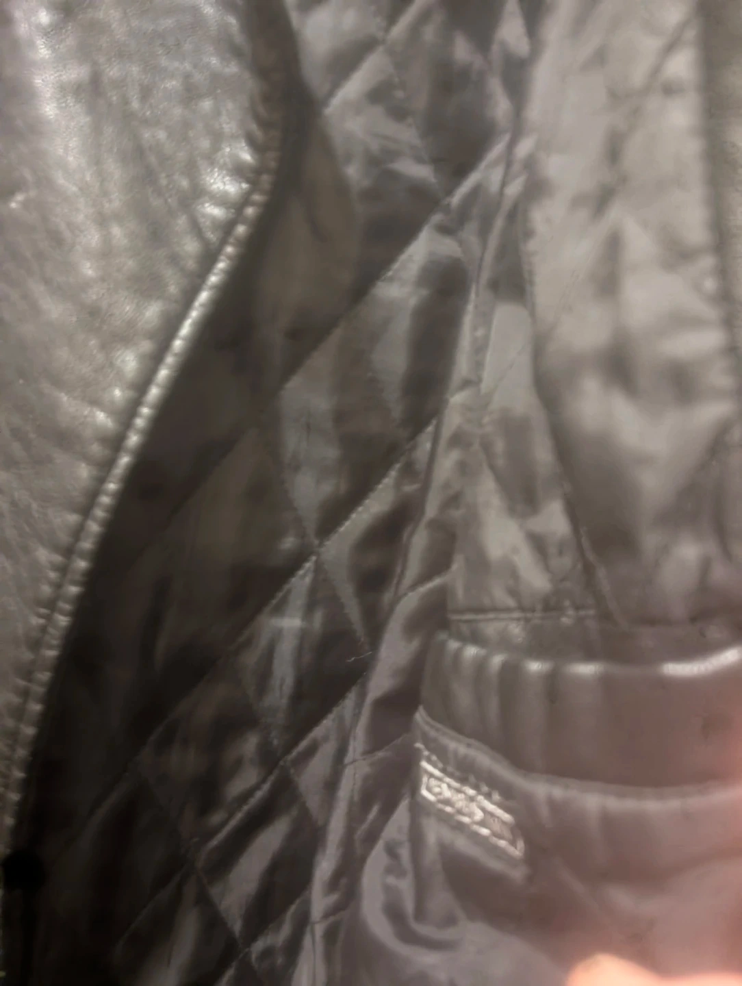 This is a classic black moto jacket from Members Only. It's made with faux leather and features a quilted lining for extra warmth. Includes zippered pockets and a snap-button collar. It's a stylish choice for cooler weather!