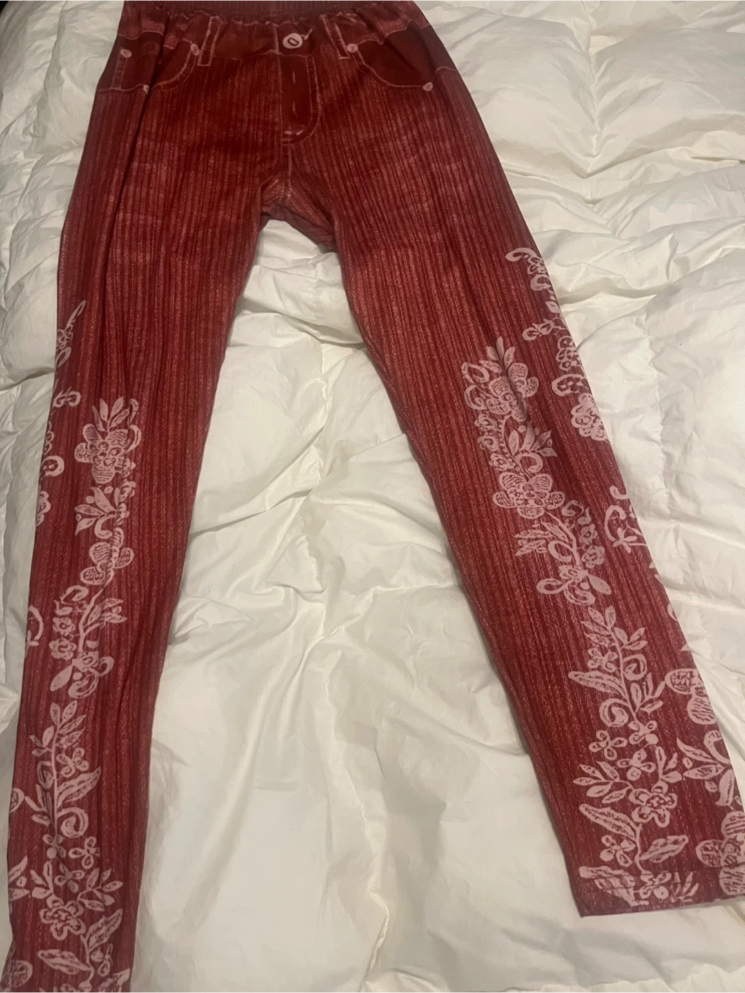 Comfy elastic waist leggings with a red denim-like print and white floral detailing down the sides. These are a size medium and made of a soft, stretchy material.