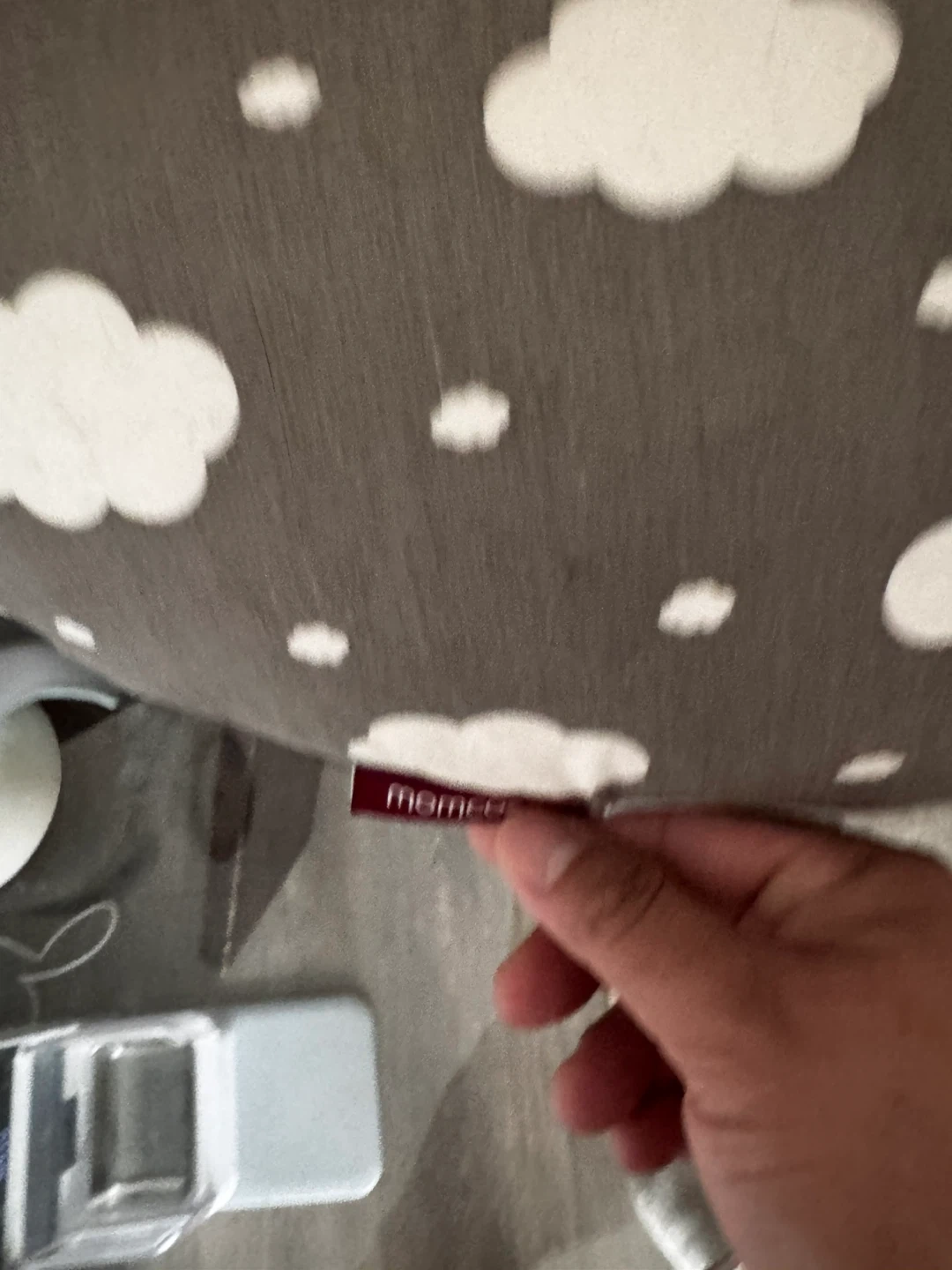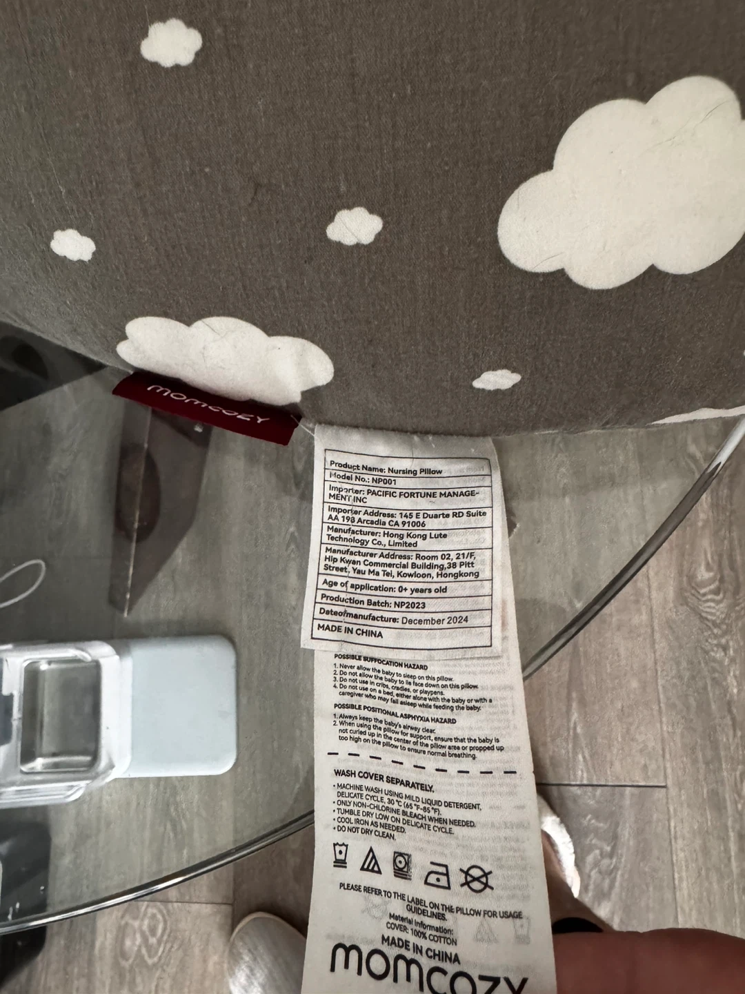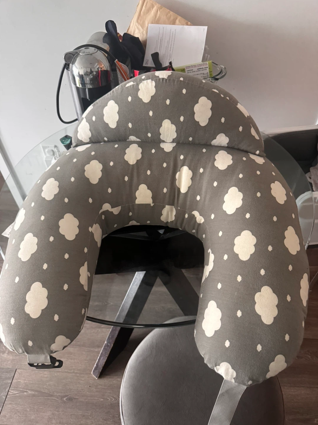 This is a Momcozy nursing pillow with a cloud pattern. It's made of 100% cotton. The pillow is designed for ages 0+ years. It's great for supporting babies during feeding time.