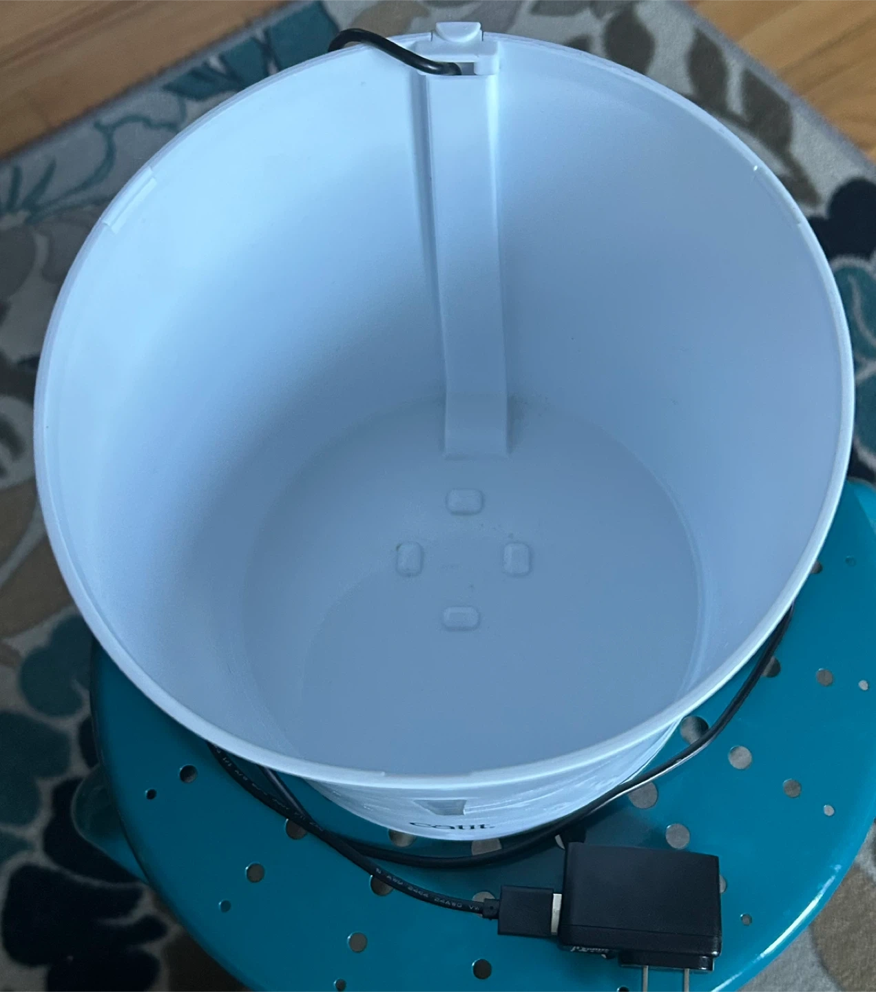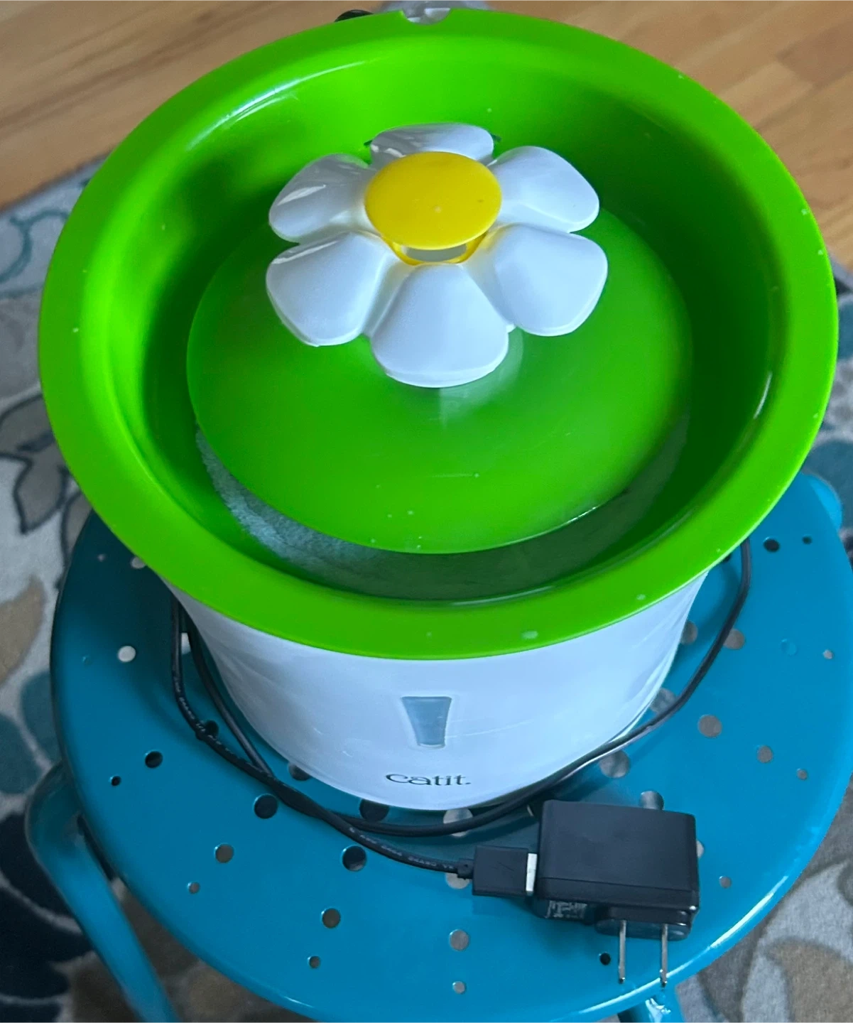 This gently used Catit pet water fountain is white with a green rim and a white and yellow flower attachment. It includes the power adapter and cord. It's designed to encourage pets to drink more water!