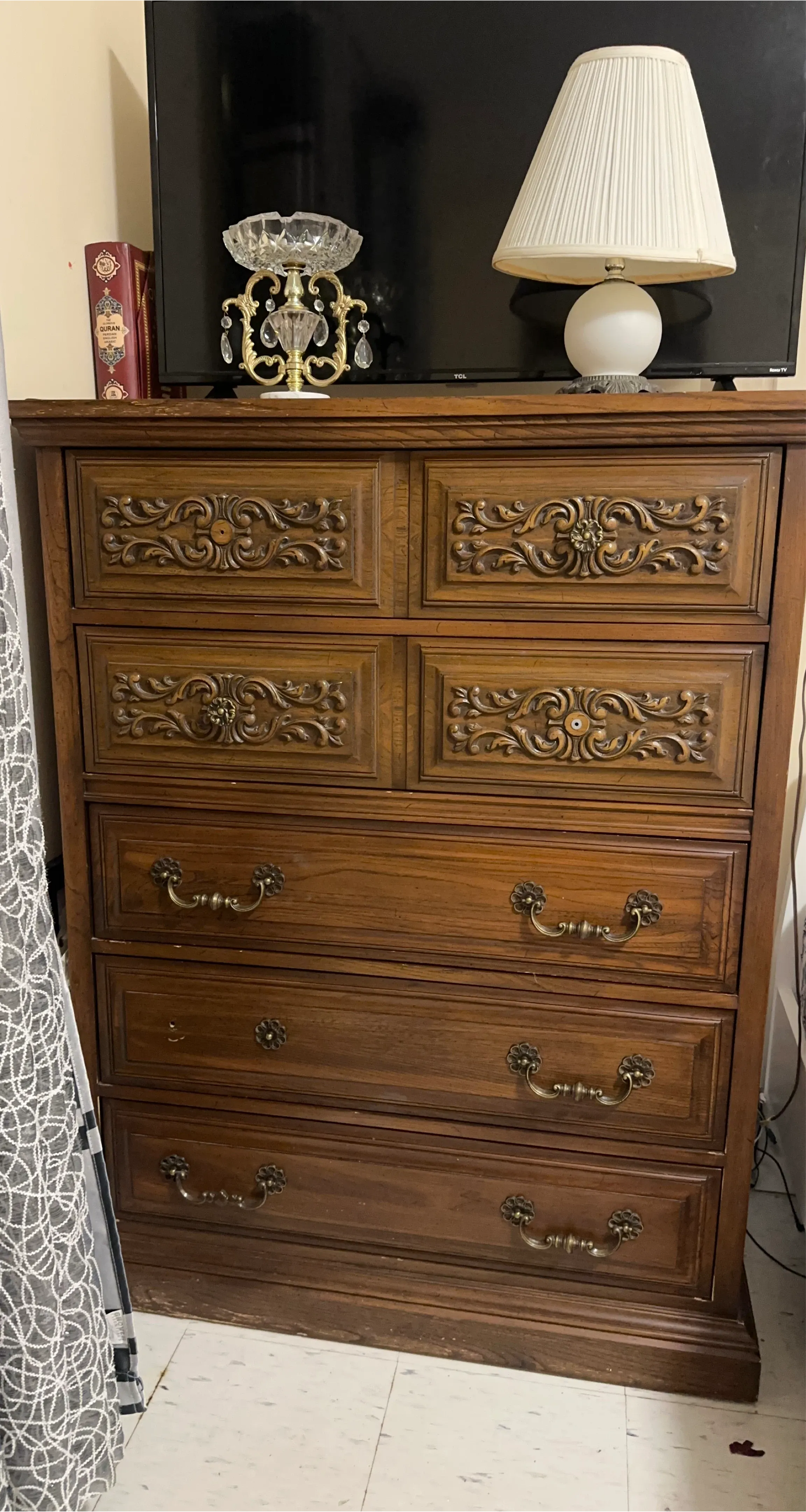 This vintage dresser features rich brown wood with intricate, ornate carvings on the top two rows of drawers. It has six drawers with decorative brass-toned hardware. The wood has a warm, aged patina. Perfect for storing clothes or linens!