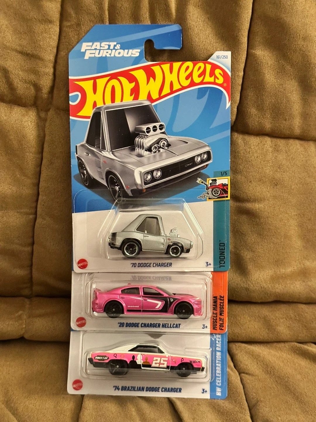 Three Hot Wheels die-cast cars featuring Dodge Chargers. Includes a '70 Dodge Charger, a '20 Dodge Charger Hellcat, and a '74 Brazilian Dodge Charger. These are 1:64 scale models. Recommended for ages 3 and up.