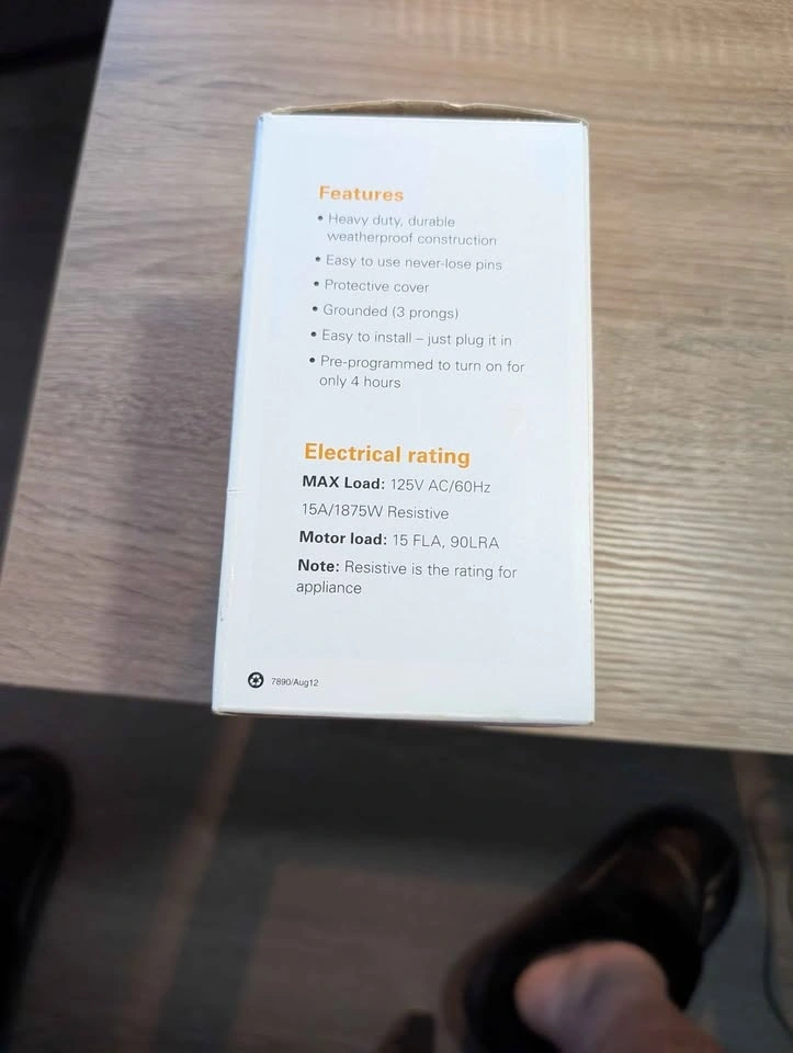 Stay ready for winter with this Woods Block Heater Timer. Designed to save you up to $25 a year on energy costs by automating your car's heater. Heavy-duty & Weatherproof: Built to withstand tough outdoor conditions. Easy to Use: Just plug it in; features never-lose pins. Safety: Grounded 3-prong plug with a protective cover. Savings: Pre-programmed for 4-hour cycles to optimize heating and reduce power bills. Electrical Rating: 125V AC / 15A / 1875W.