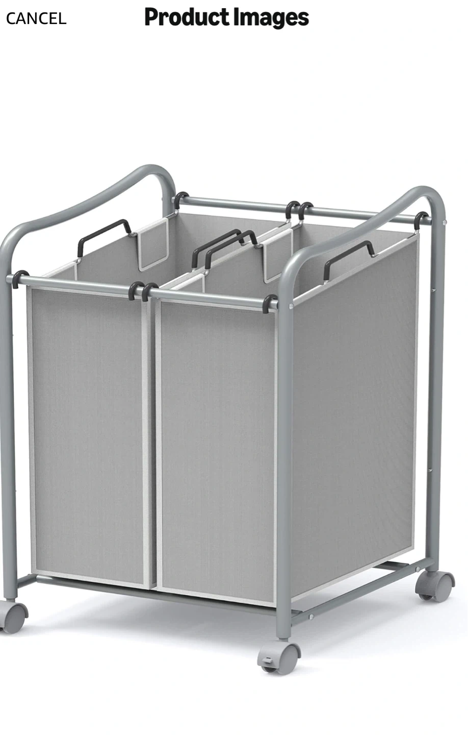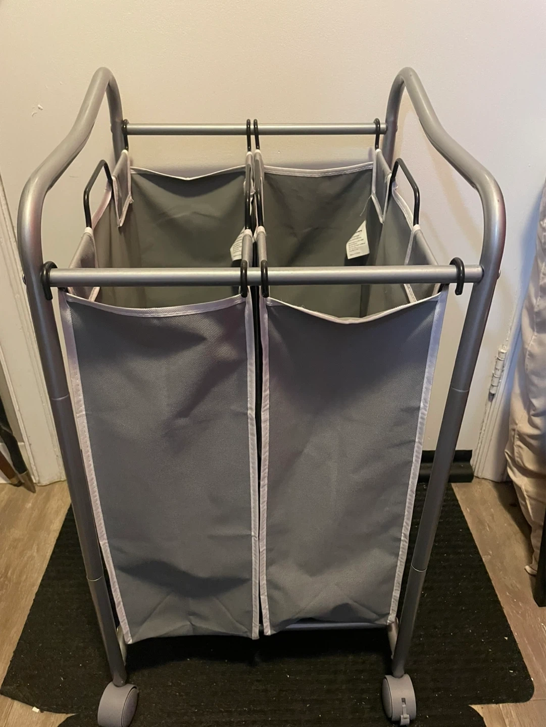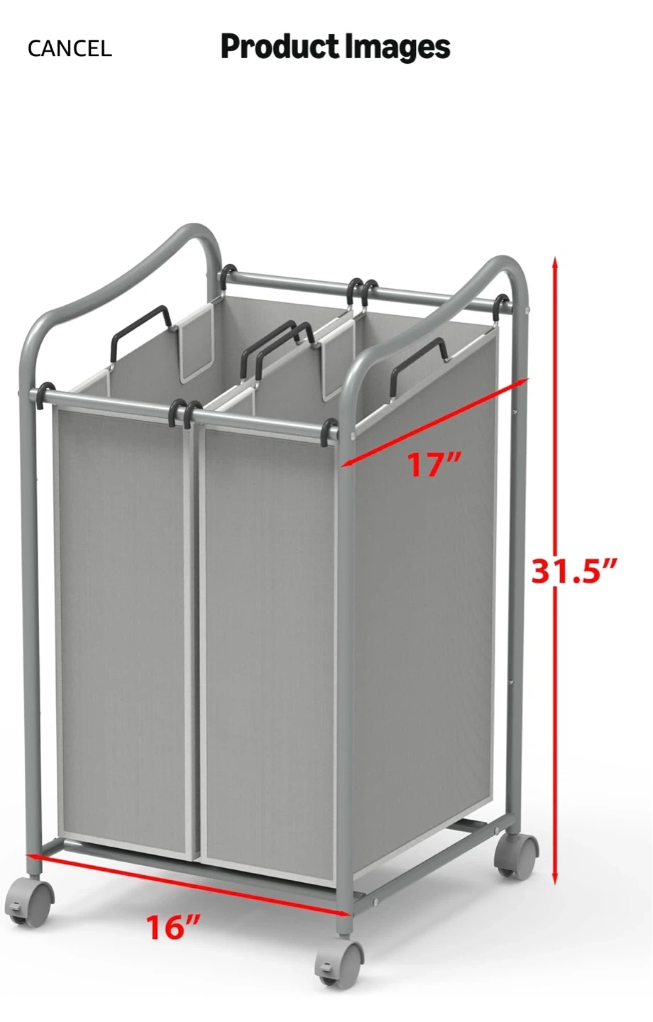 This double laundry hamper is made of a metal frame and fabric compartments. It measures 16" L x 17" W x 31.5" H. It's equipped with wheels for easy transport. Great for sorting laundry!