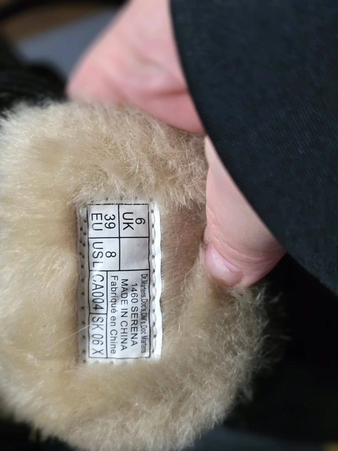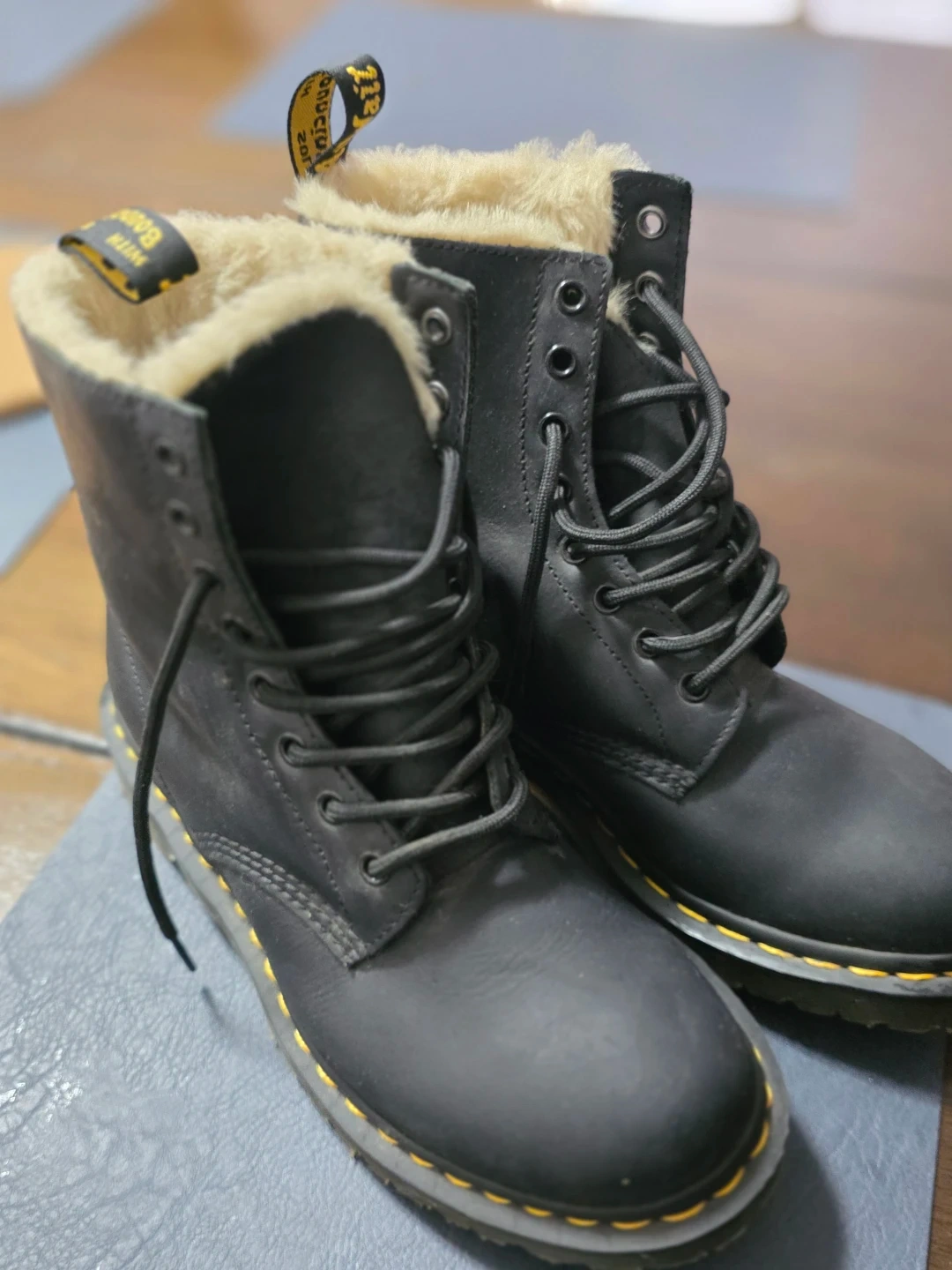 Dr. Martens 1460 Serena boots with faux fur lining. Women's size 8 UK / 39 EU. Durable black leather construction. Perfect for keeping your feet warm during colder months!