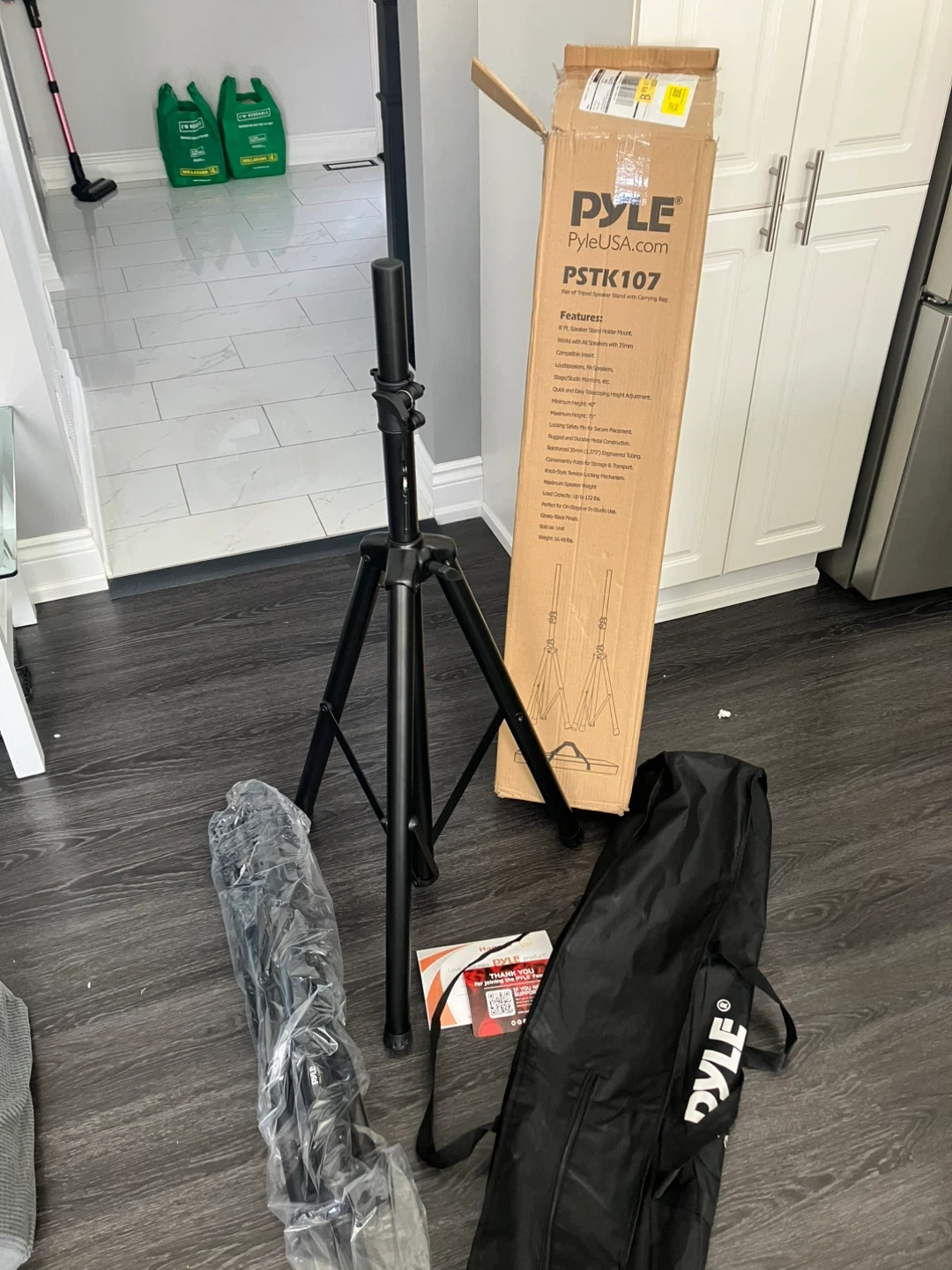This is a Pyle PSTK107 tripod speaker stand. It extends up to 6 feet and includes a carrying bag for easy transport. The stand features rugged and durable metal construction with a glossy black finish. It's perfect for on-stage or in-studio use, supporting up to 132 lbs.