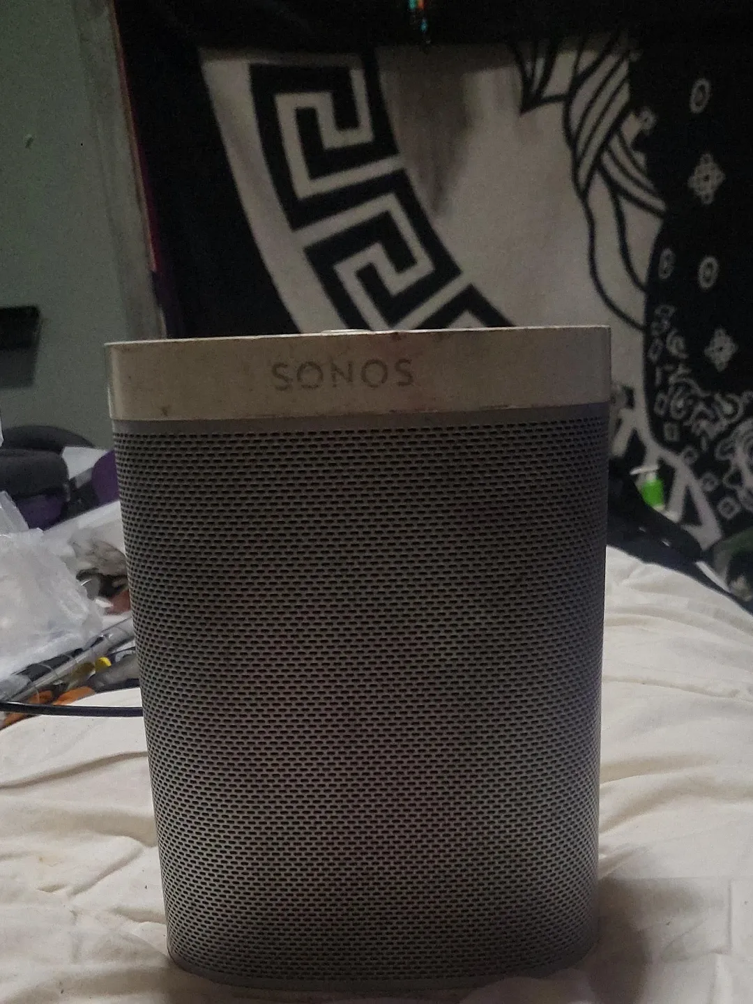This is a Sonos portable speaker. It's grey and has a mesh grille design. It's great for taking music anywhere!