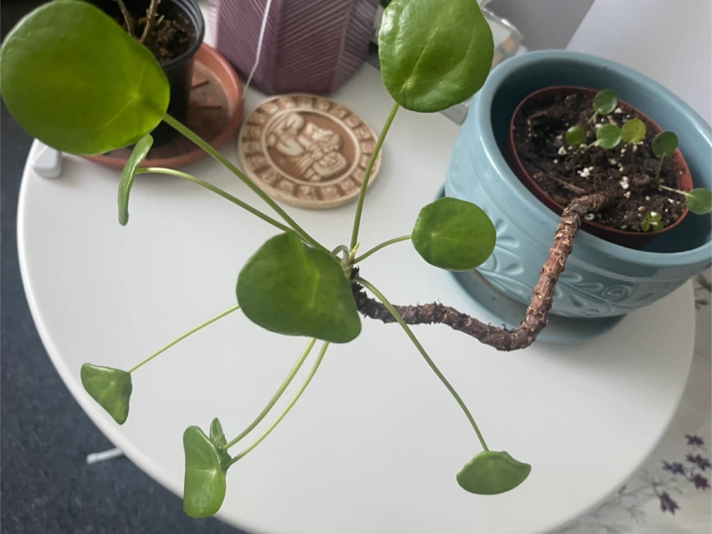 This is a Chinese Money Plant, also known as Pilea Peperomioides. It's a lovely houseplant with unique, round, coin-like leaves. The plant comes in a light blue ceramic pot. It's great for adding a touch of green to any room!