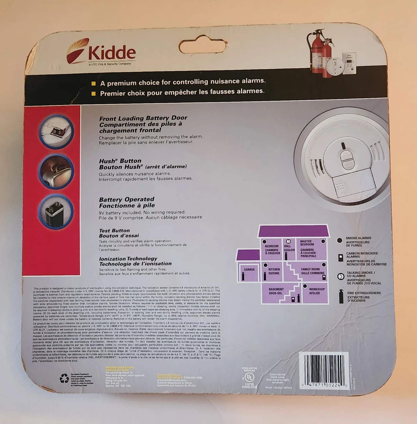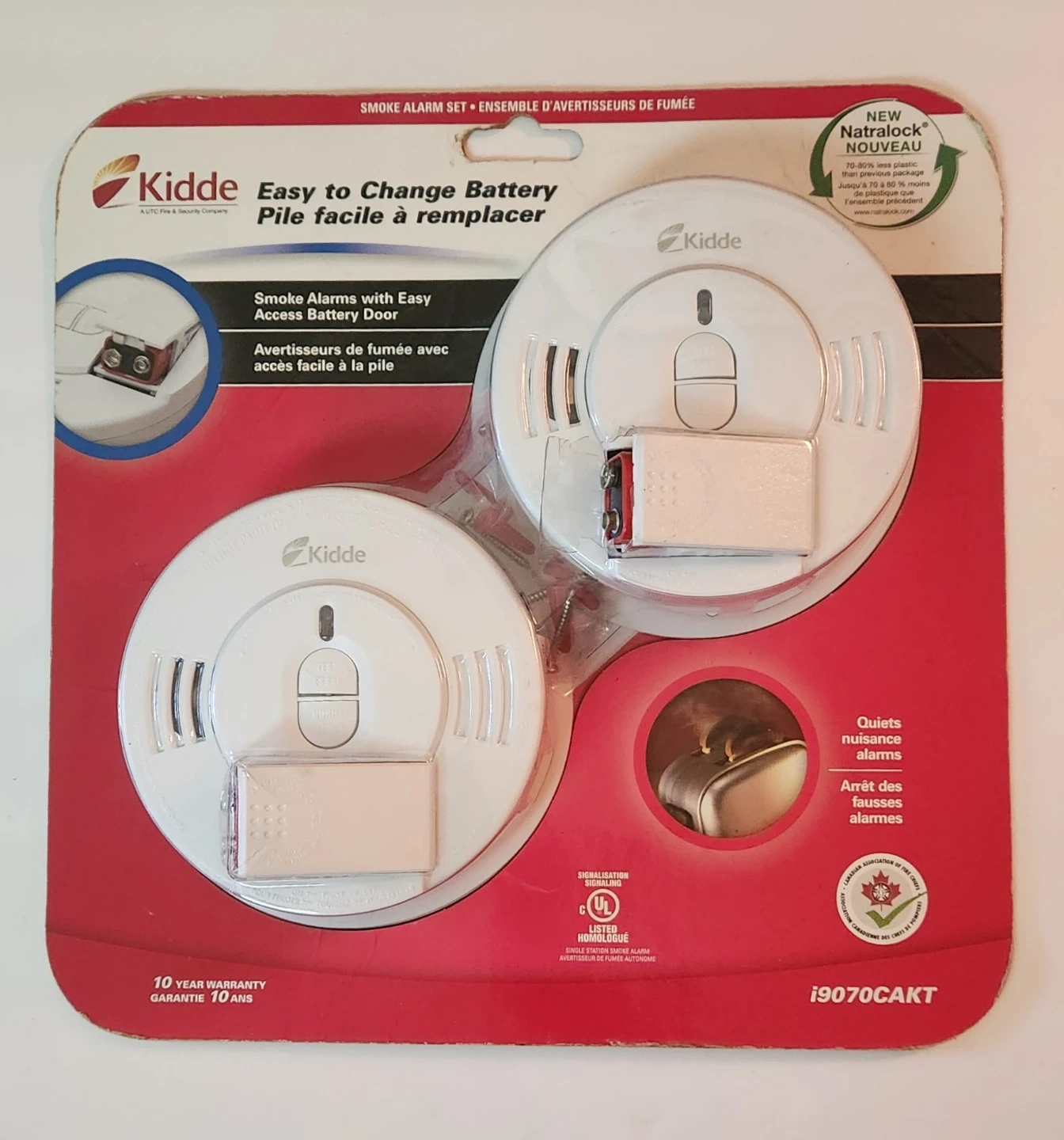 The Kidde 0976CAKT ( 2 Pack) is a 9 V front-loading battery operated, single station smoke alarm. The 0976CAKT offers a Hush® button that temporarily silences nuisance alarm. The front-loading battery door allows user to change the battery without removing the alarm from the mounting bracket making battery replacement easy and convenient.
