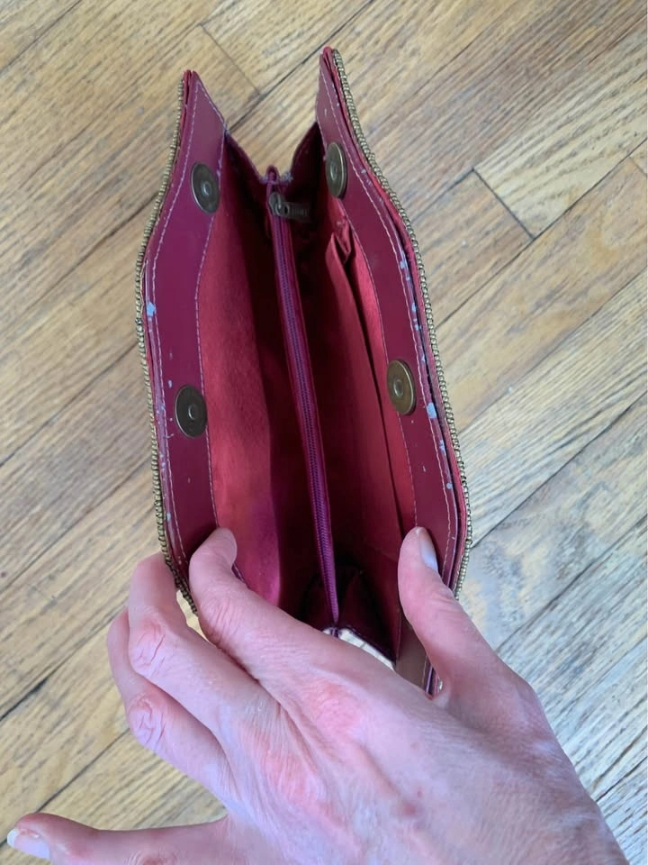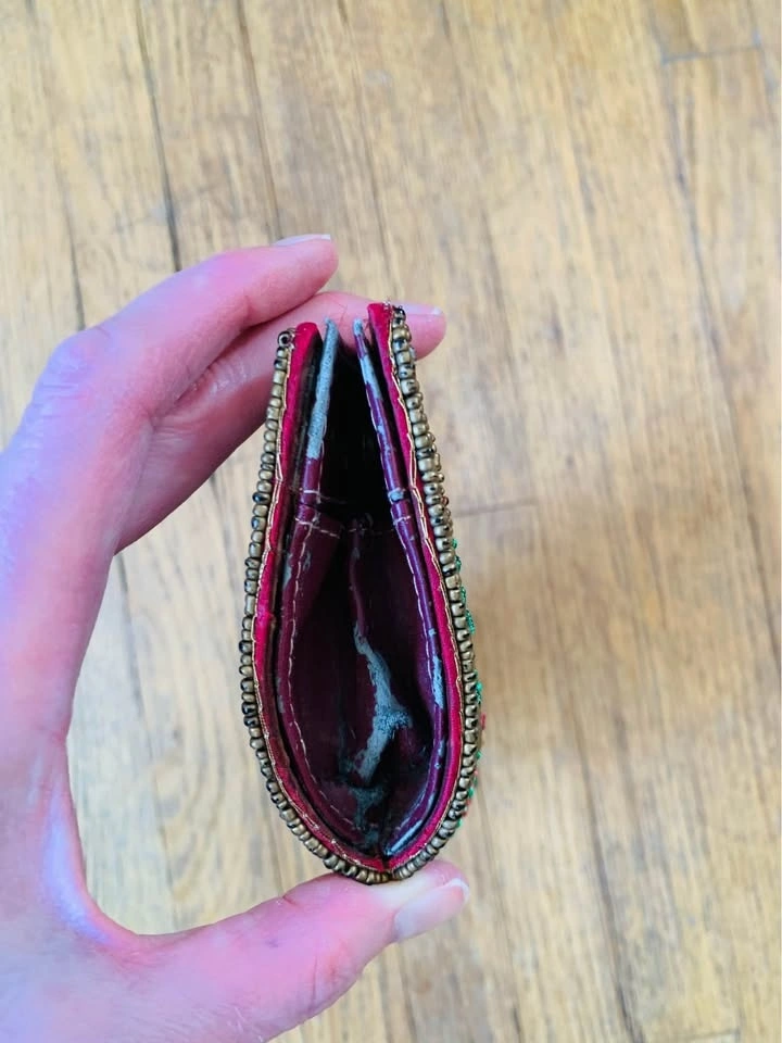 A stunning antique piece. A Moroccan clutch of sequins and rhinestones and embroidery. The outside is pristine. The bag closes firmly and securely, and perfectly inside. There is several compartments zippered and not the leather has shown a bit of wear. Please see pictures. It is still in perfectly useable condition, very strong and substantial.