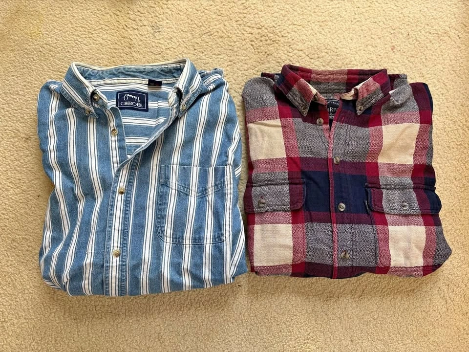Porch pick up on Kennedy road and Stouffville road, Markham Stouffville area. 90’s vintage men’s button down shirts - $20 takes both. Cherokee blue and white size large 100 percent cotton, some yellowing around the collar, barely noticeable could come out with a good washing. North River Design By Nature, couldn’t find a tag but I’m guessing it’s roughly size large as well.