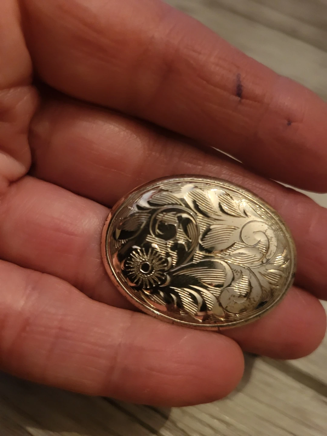 This oval brooch features intricate floral engraving. It's made of sterling silver and was crafted in Canada. The pin backing is secure and functional.