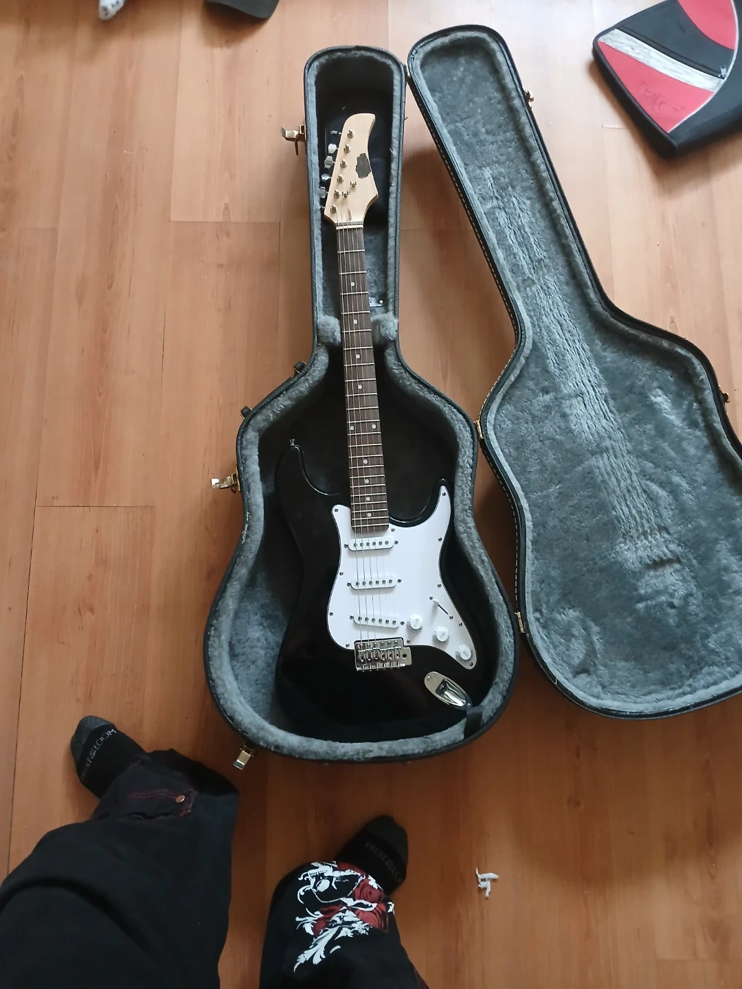 This is a black electric guitar in a hard case. It has a white pickguard and three pickups. The neck is light wood the case is included.