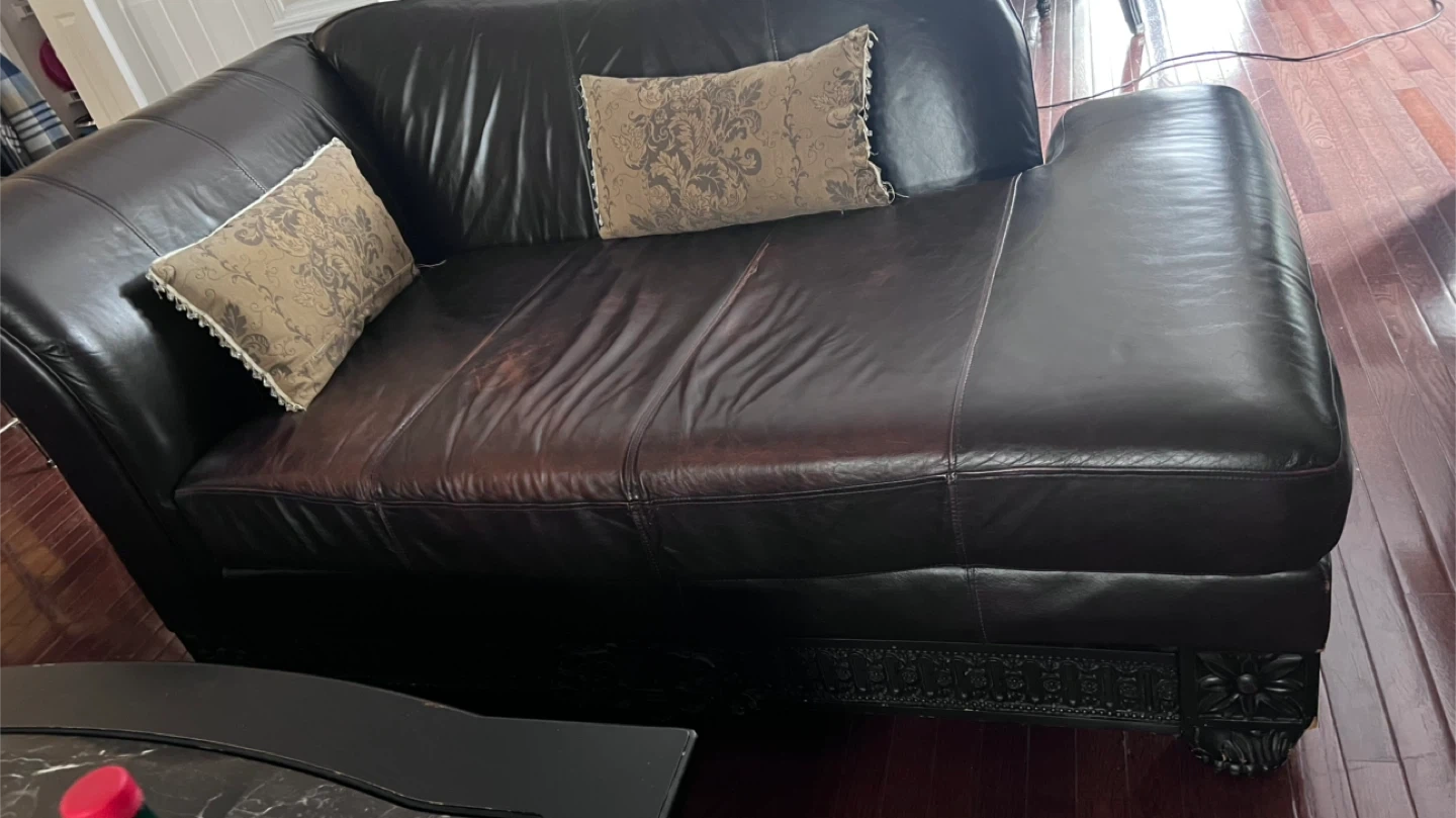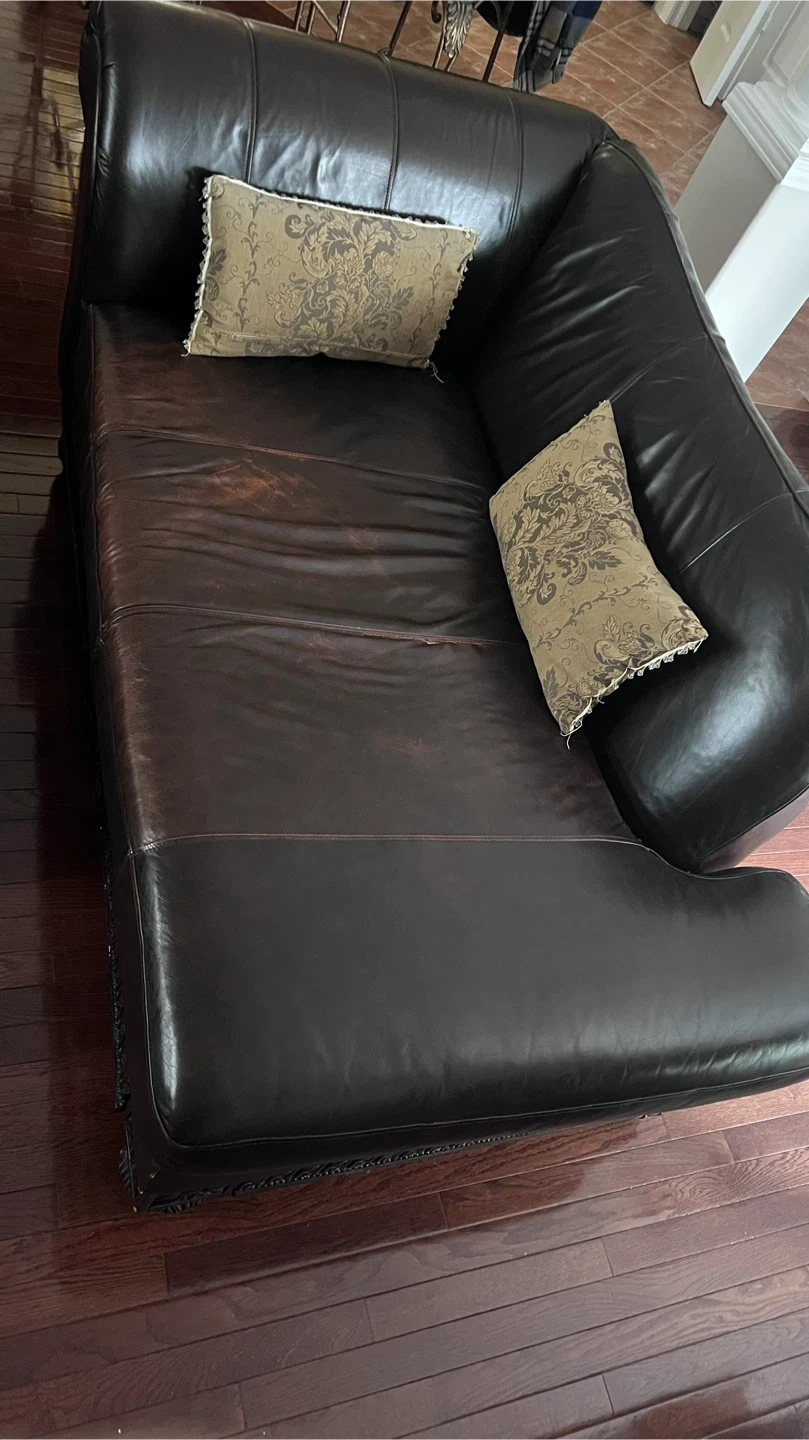 Comfortable brown leather sofa, comes with two decorative accent pillows. The leather shows some signs of wear, adding character. This sofa's design offers ample seating space.