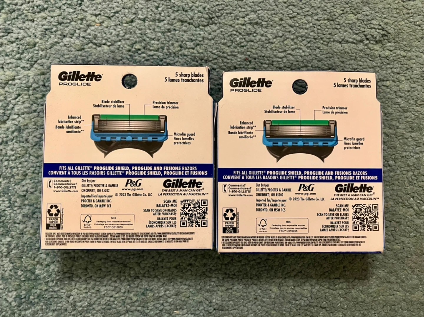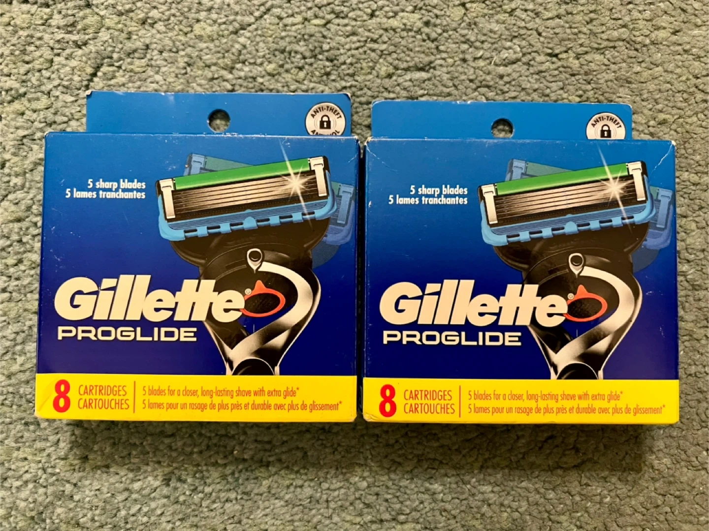 Two packages of Gillette ProGlide razor blade cartridges included.