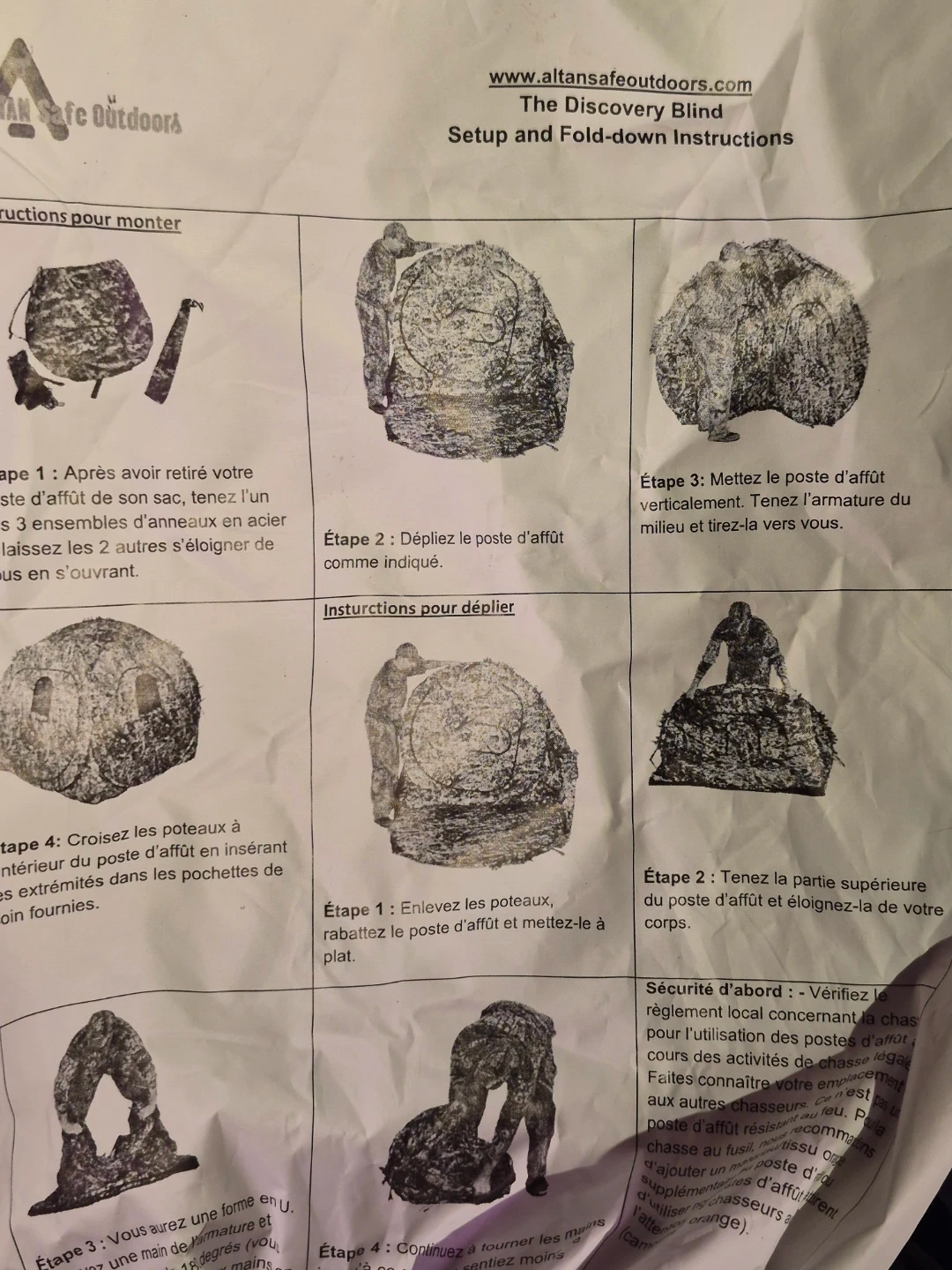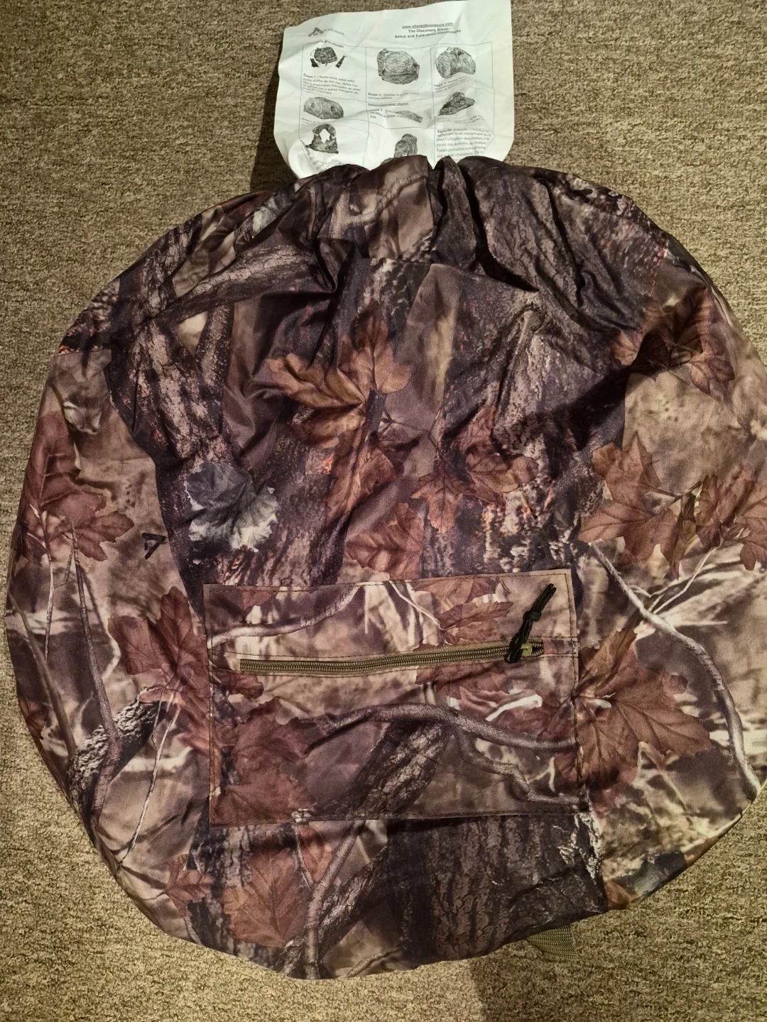 This is a hunting blind with a camouflage pattern. It includes a front pocket with a zipper. The item comes with setup and fold-down instructions.