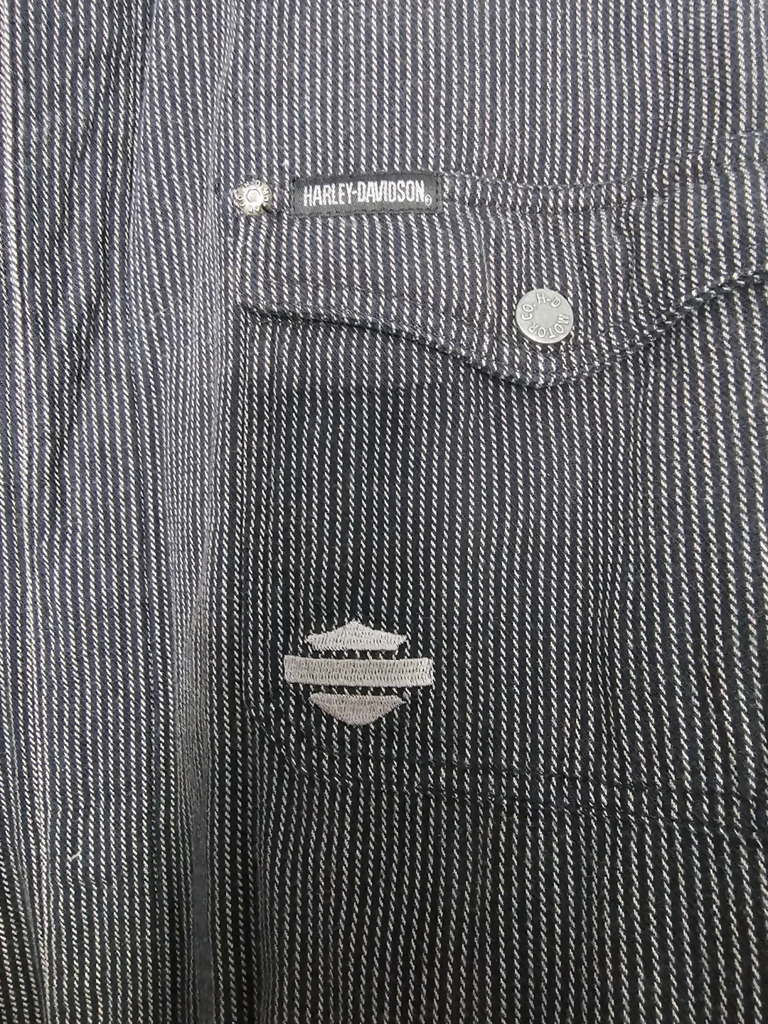 Harley-Davidson button-up shirt with a pinstripe pattern. It features two chest pockets and a classic collar. Made from a durable fabric, it's a nice piece for any fan.