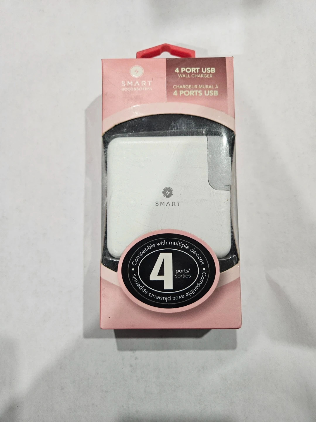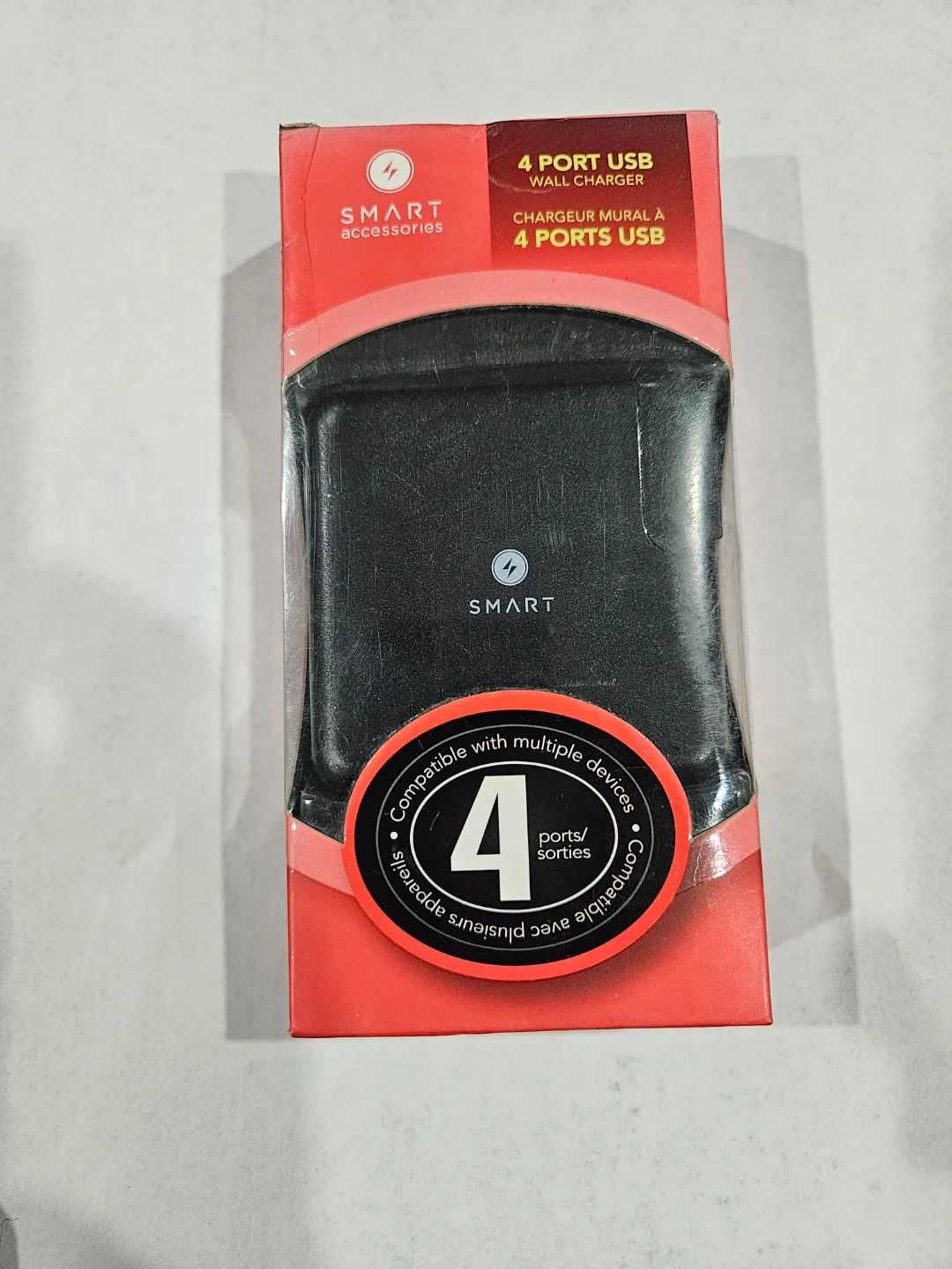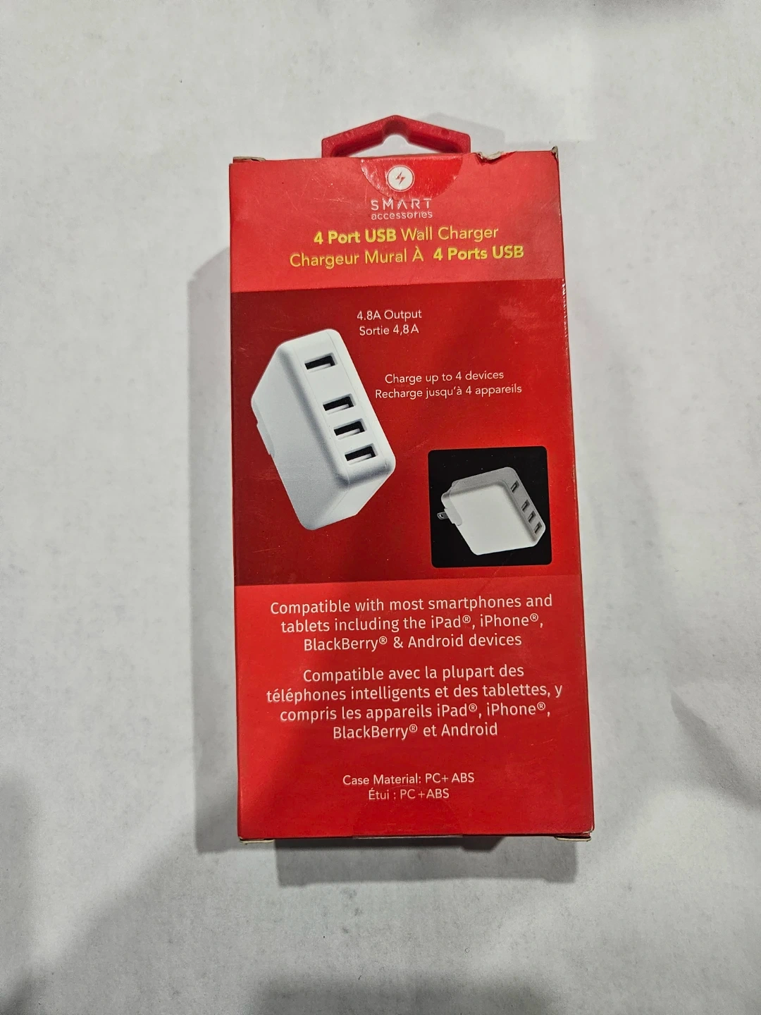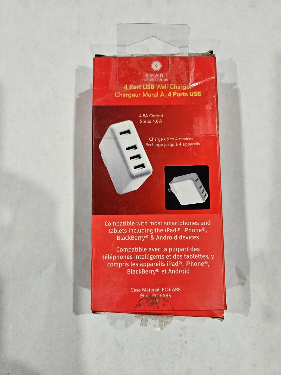 Charge up to four devices simultaneously with this 4-port USB wall charger. It provides 4.8A output and is compatible with most smartphones and tablets. Case material is PC+ABS - Blk.