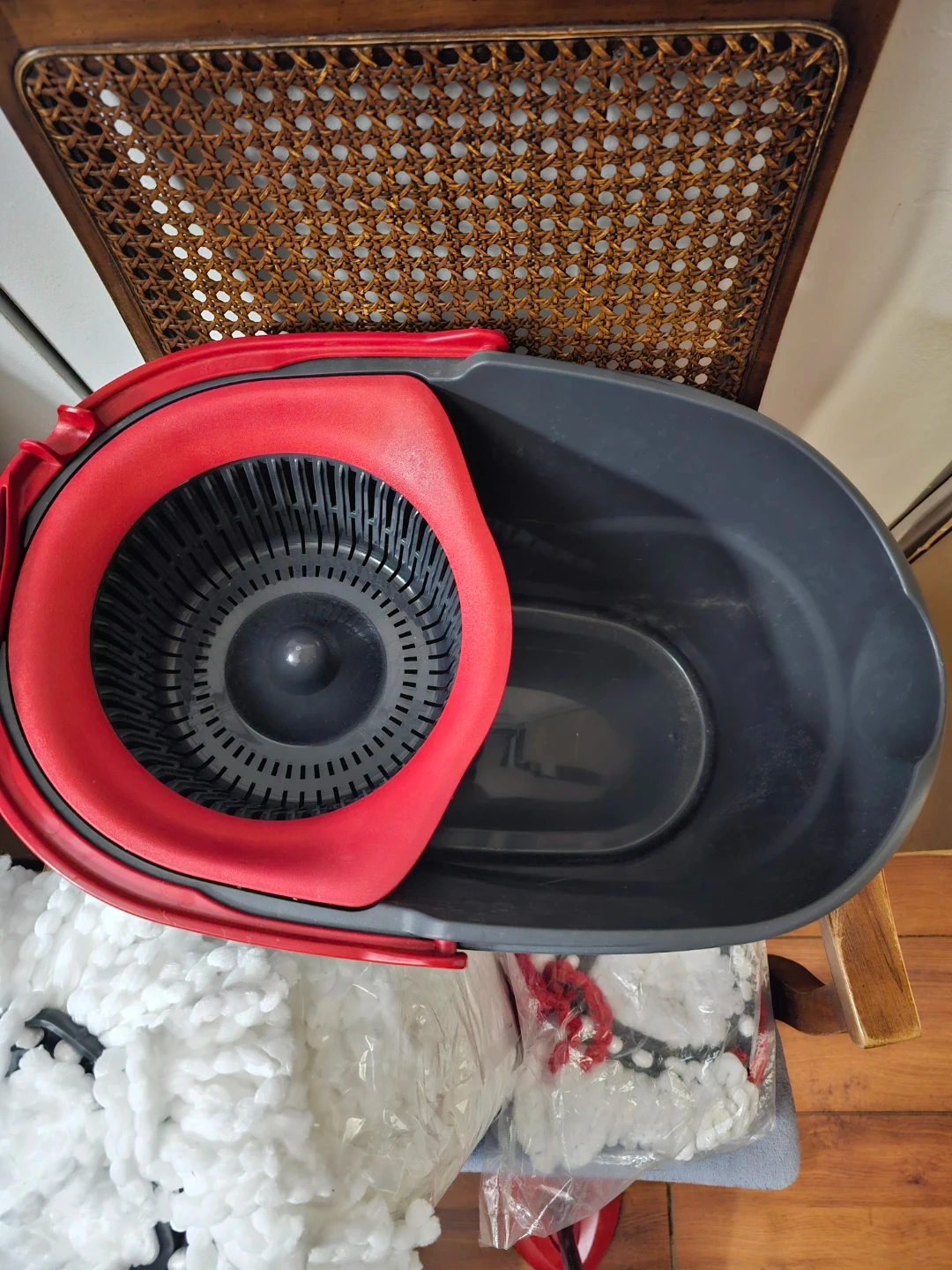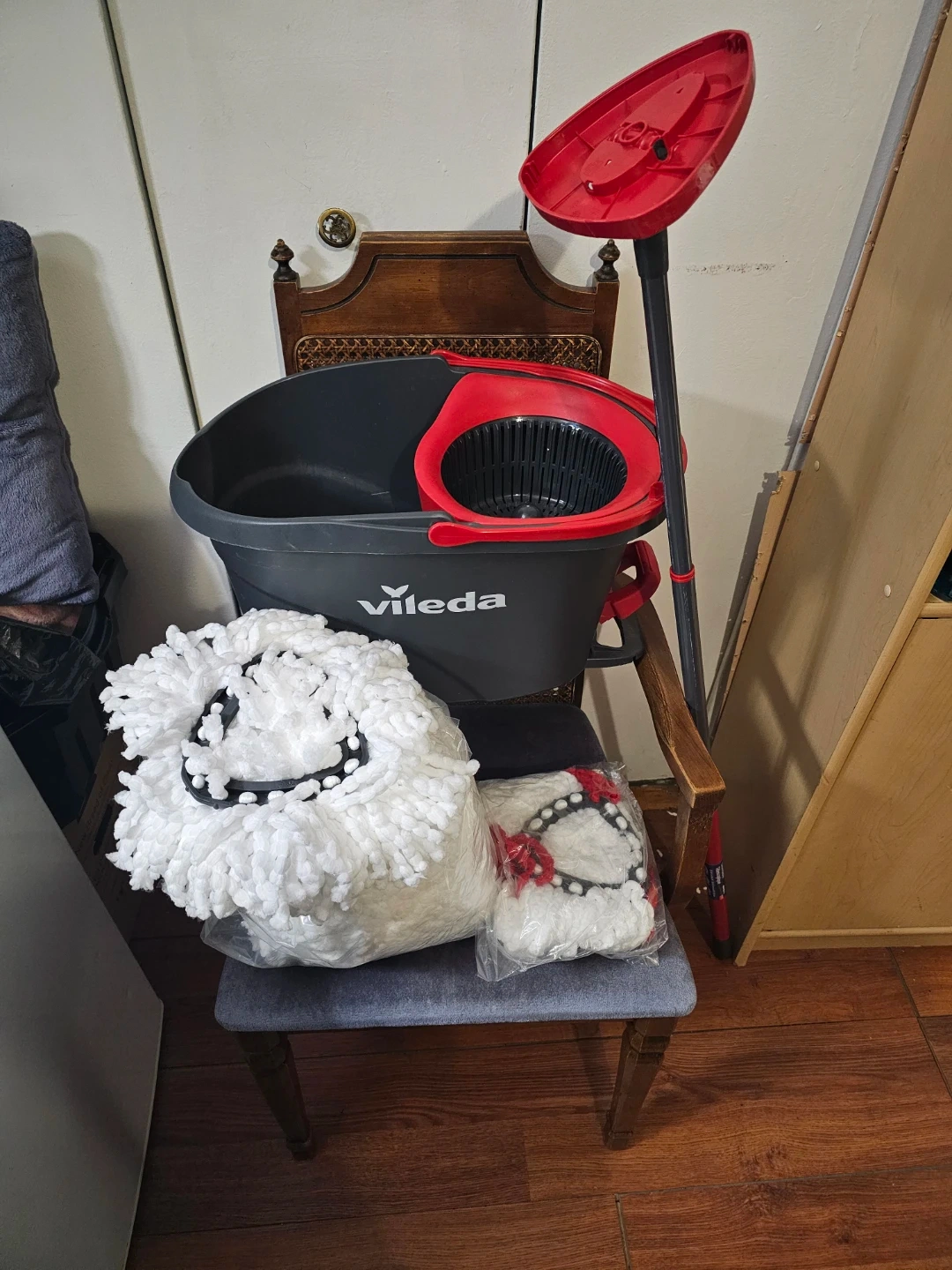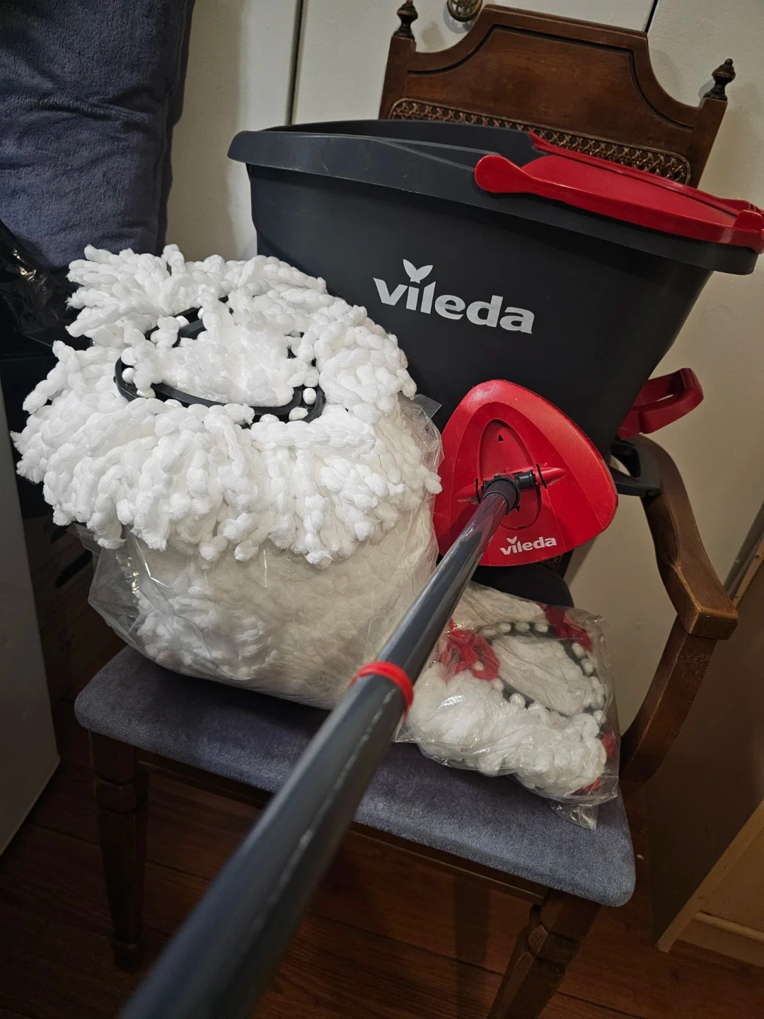 This Vileda Spin & Sparkle mop set comes with a bucket and handle. It includes one mop head attached to the handle and one extra mop head in packaging. Microfibre mop head for effective cleaning.