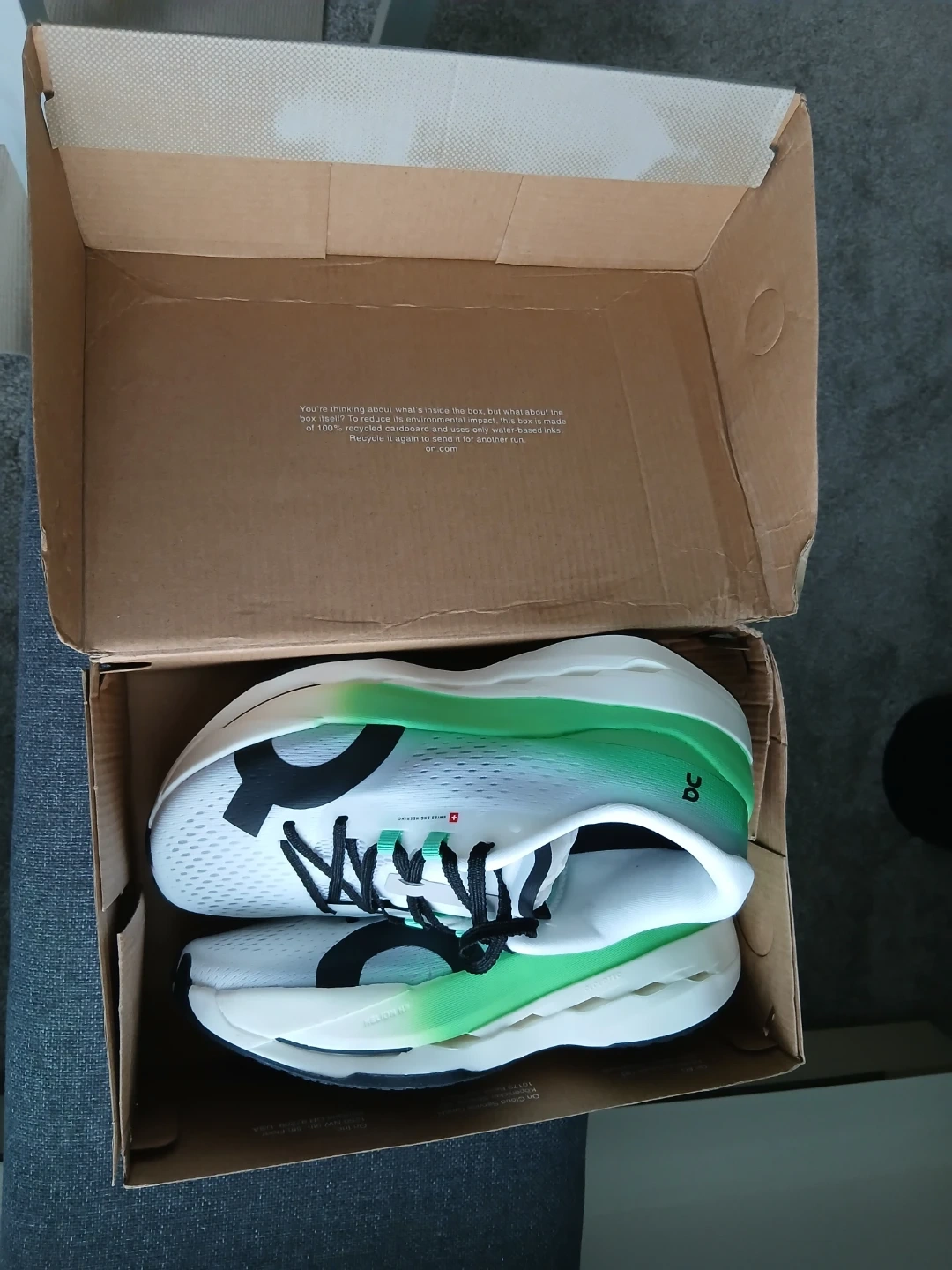 These On Running Cloudboom Max shoes are designed for performance. They feature a white and green colourway with black accents. The size is 8.5 Women's. This pair comes with its original box.